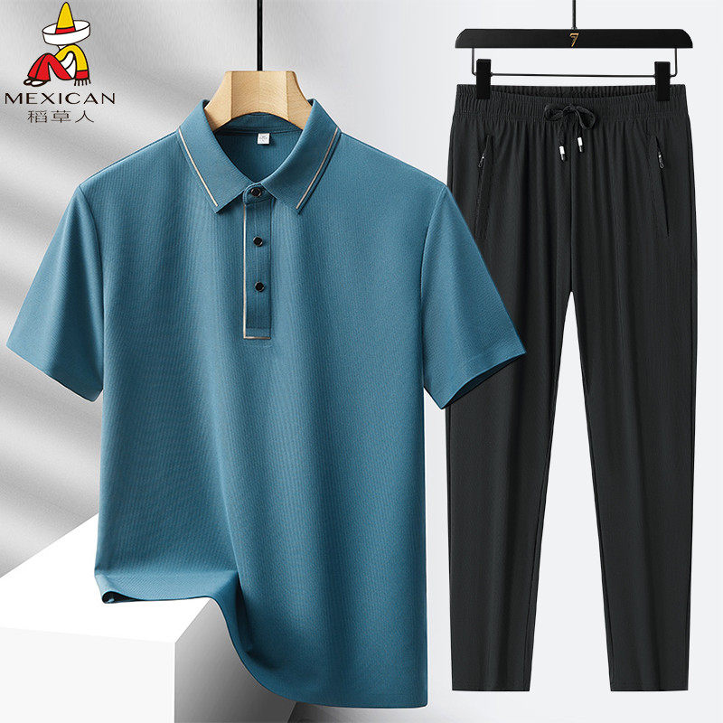 稻草人爸爸夏装冰丝休闲套装男夏季薄款短袖中老年速干运动两件套