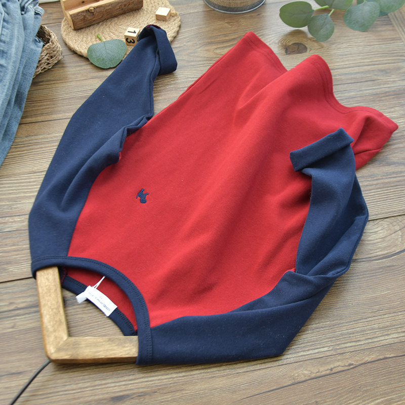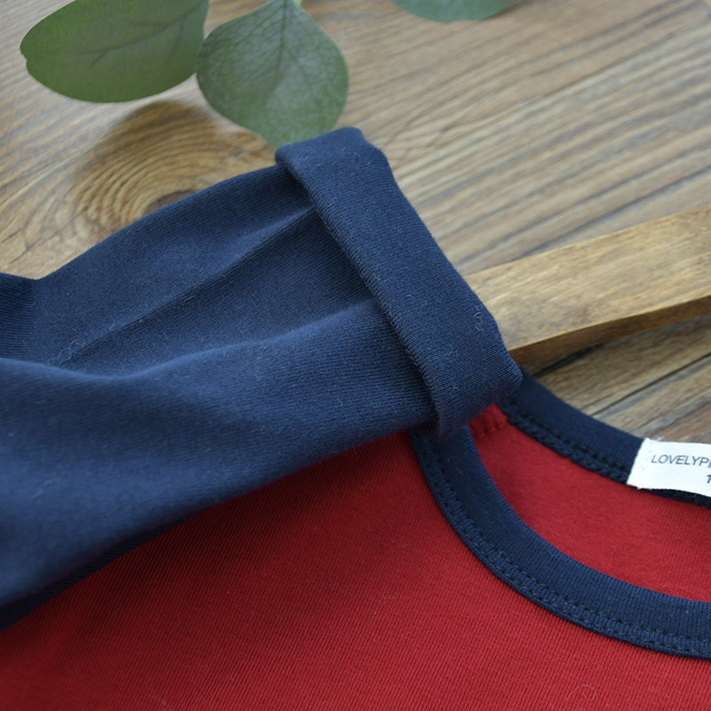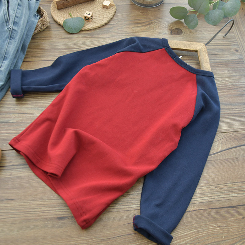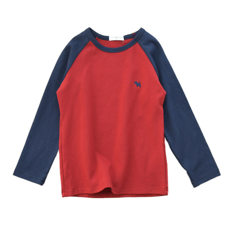 儿童深蓝拼红色插肩修身打底衫纯棉韩版男童圆领磨毛长袖t恤