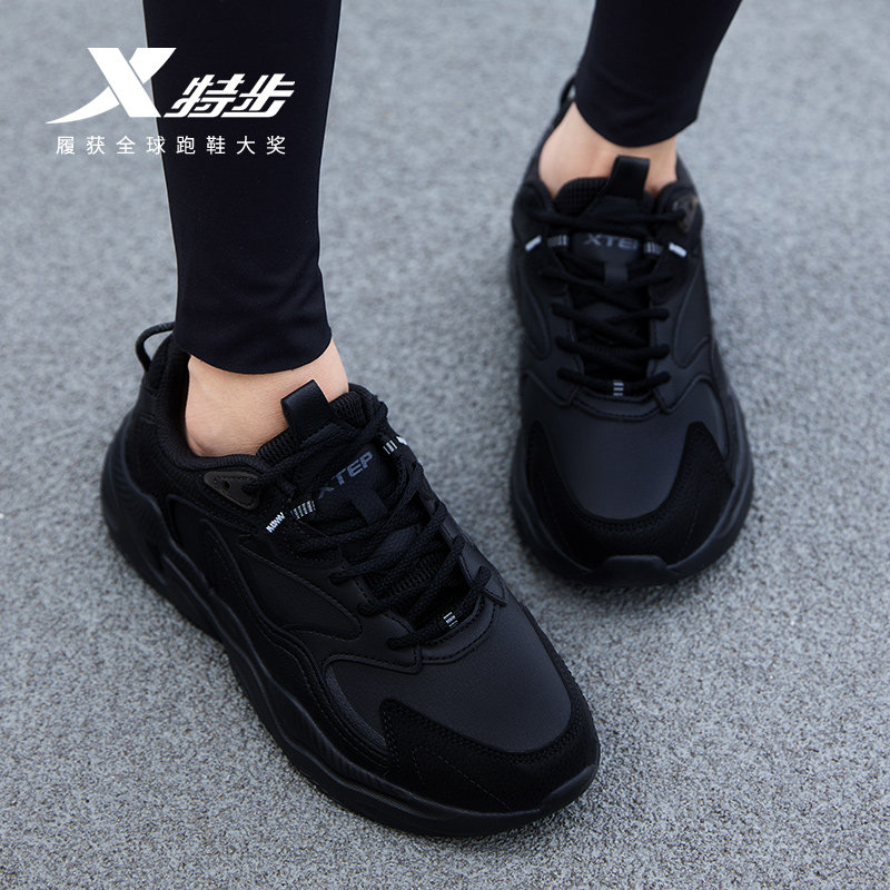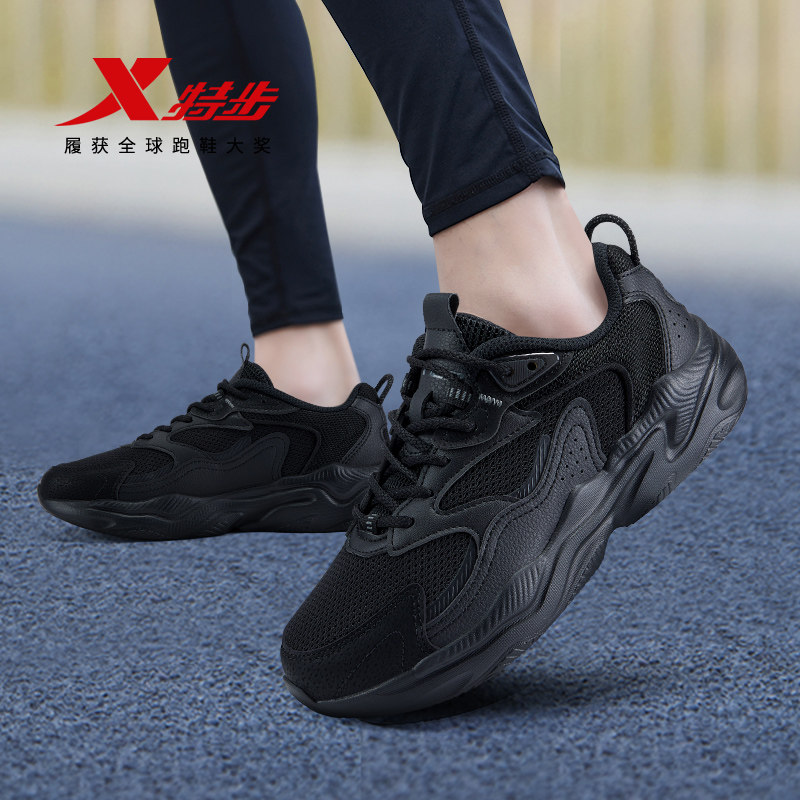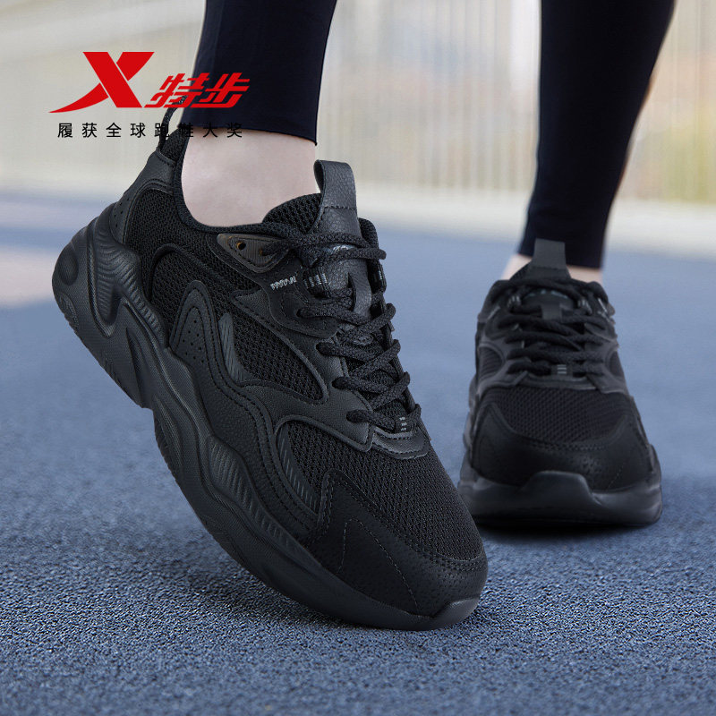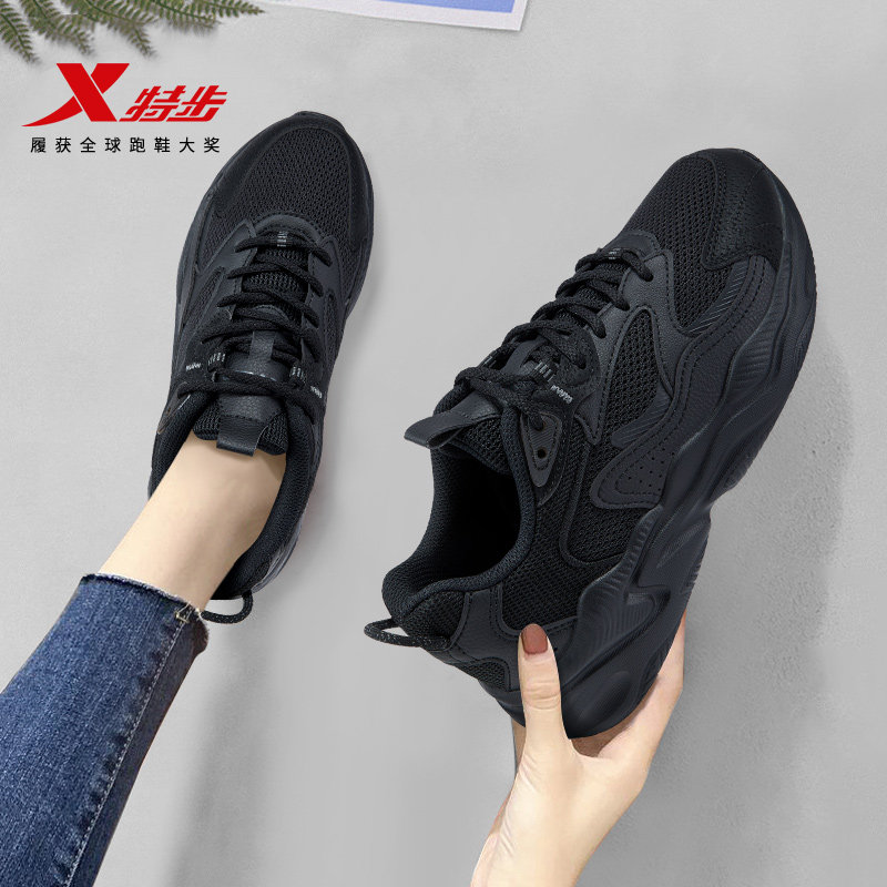 特步女鞋2026新款初中生网面运动鞋轻便软底皮面黑色休闲鞋老爹鞋