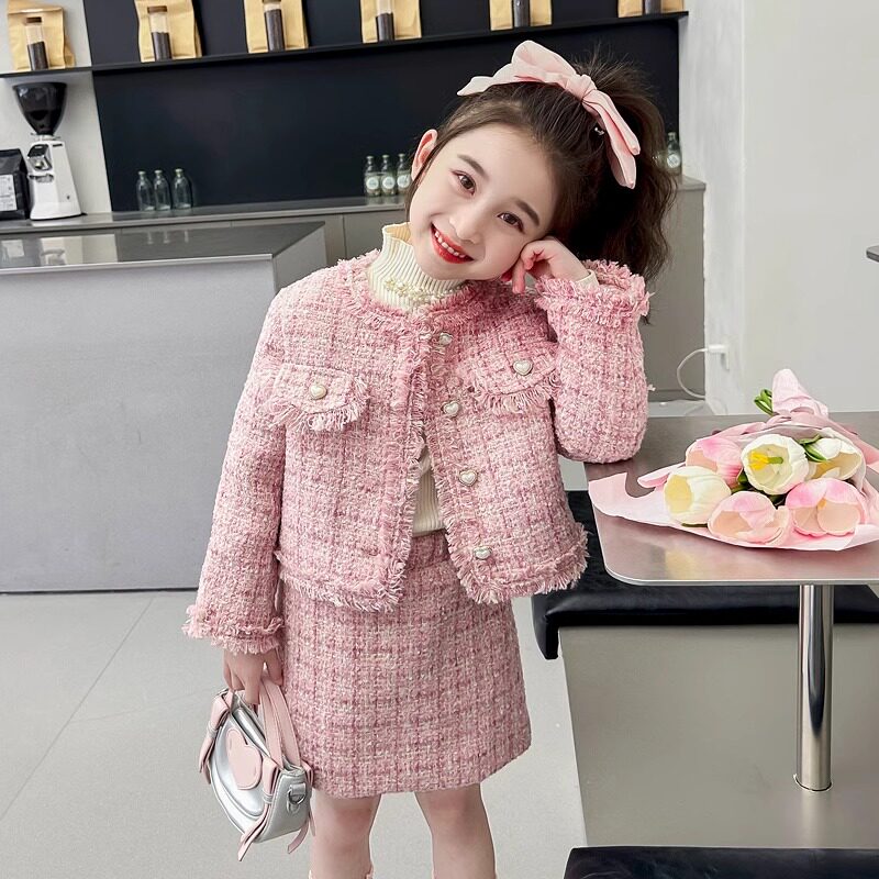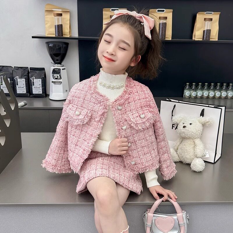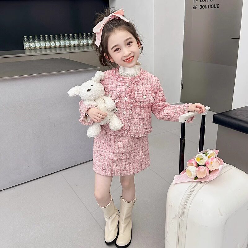 女童秋冬季加棉小香风套装裙2025新款儿童粉色甜美加厚两件套裙子