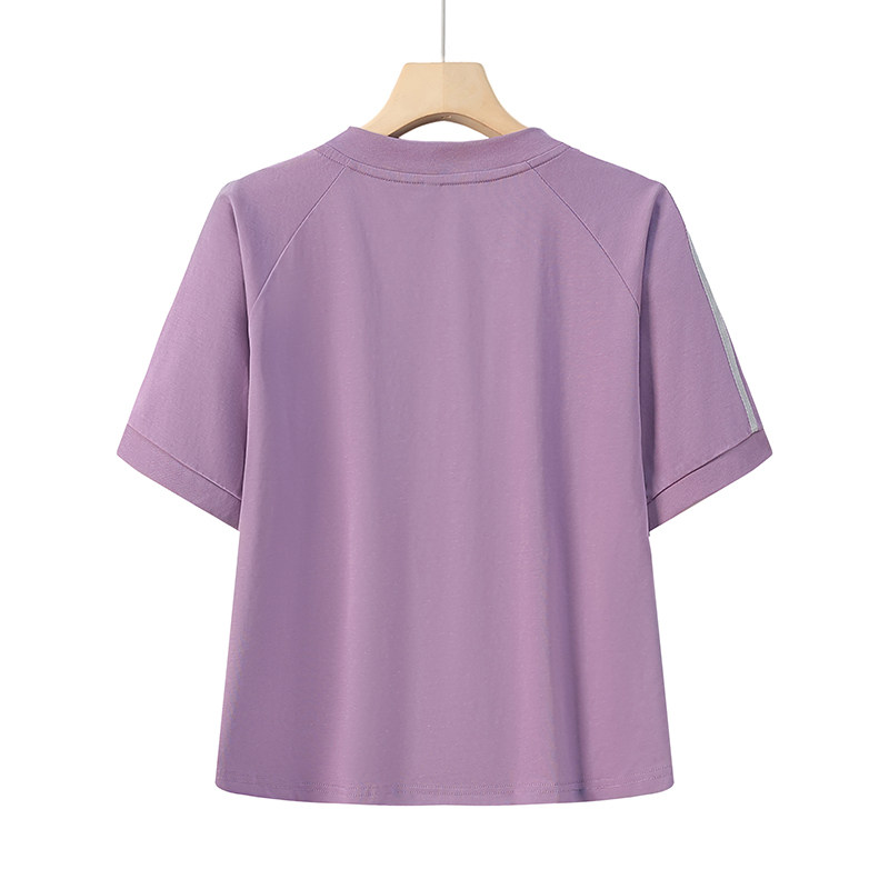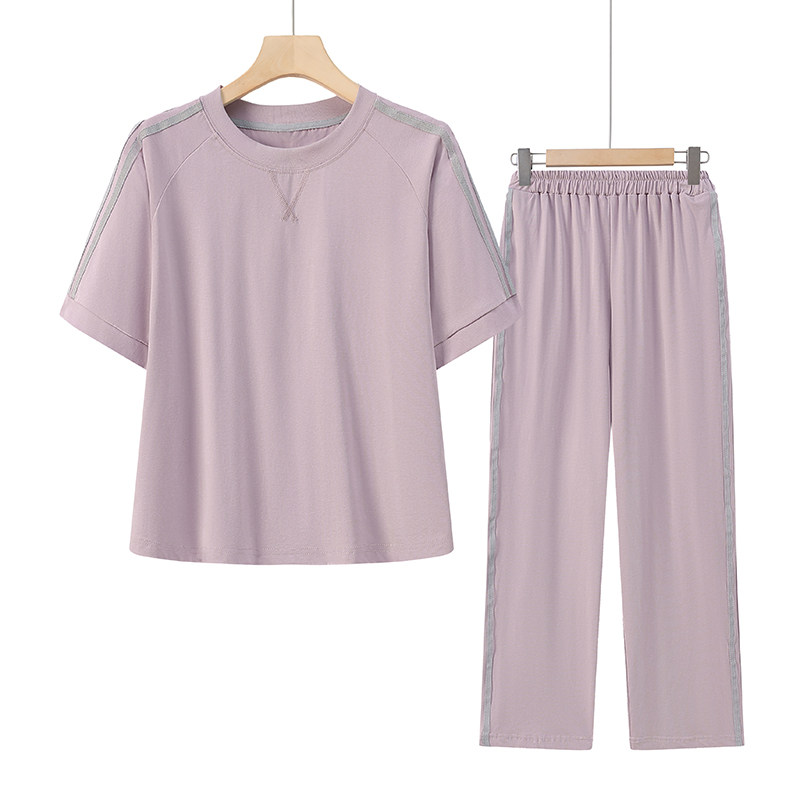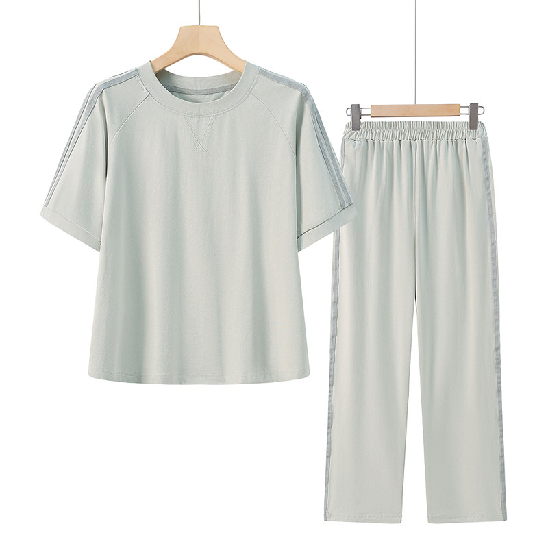 中年妈妈夏季休闲运动服全棉套装圆领条纹短袖t恤女九分裤两件套