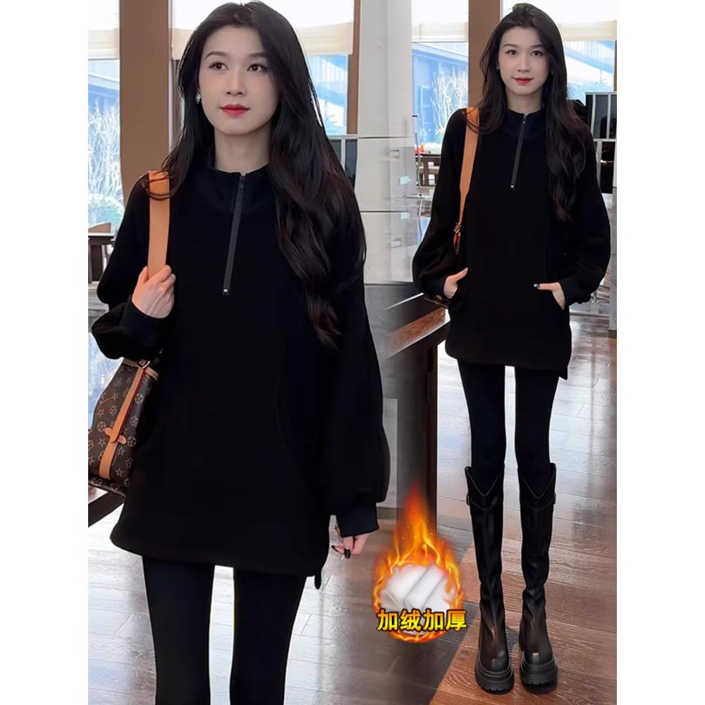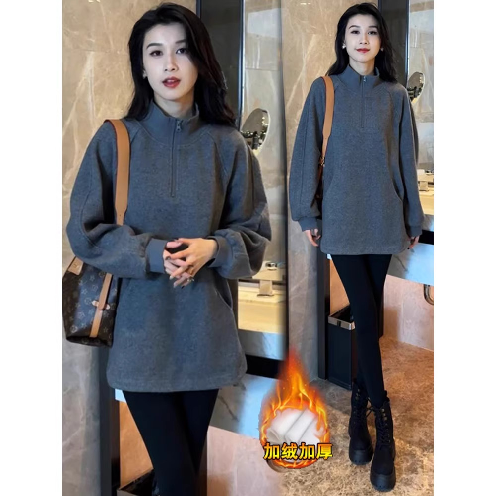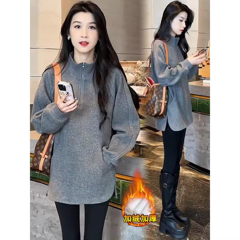 加绒加厚长袖卫衣女2026冬季新款洋气宽松中长款立领休闲上衣外套