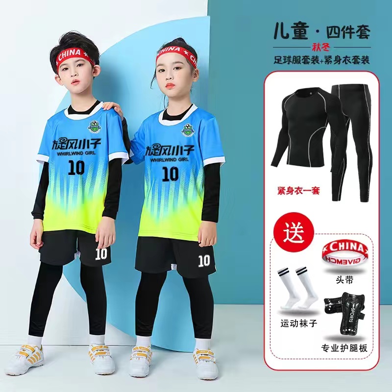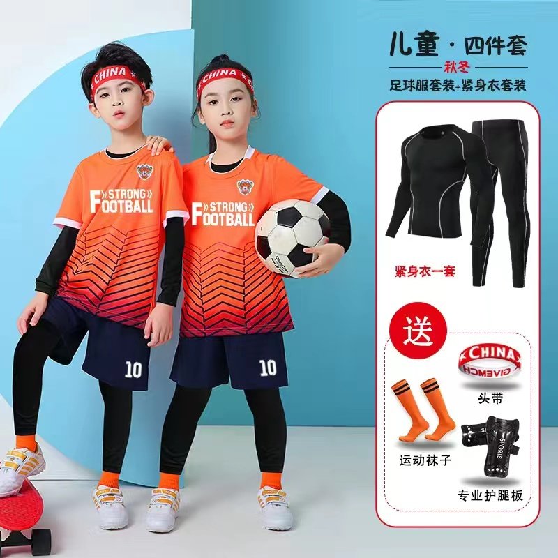 儿童足球服套装男童长袖四件套运动打底紧身衣篮球训练队服女球衣