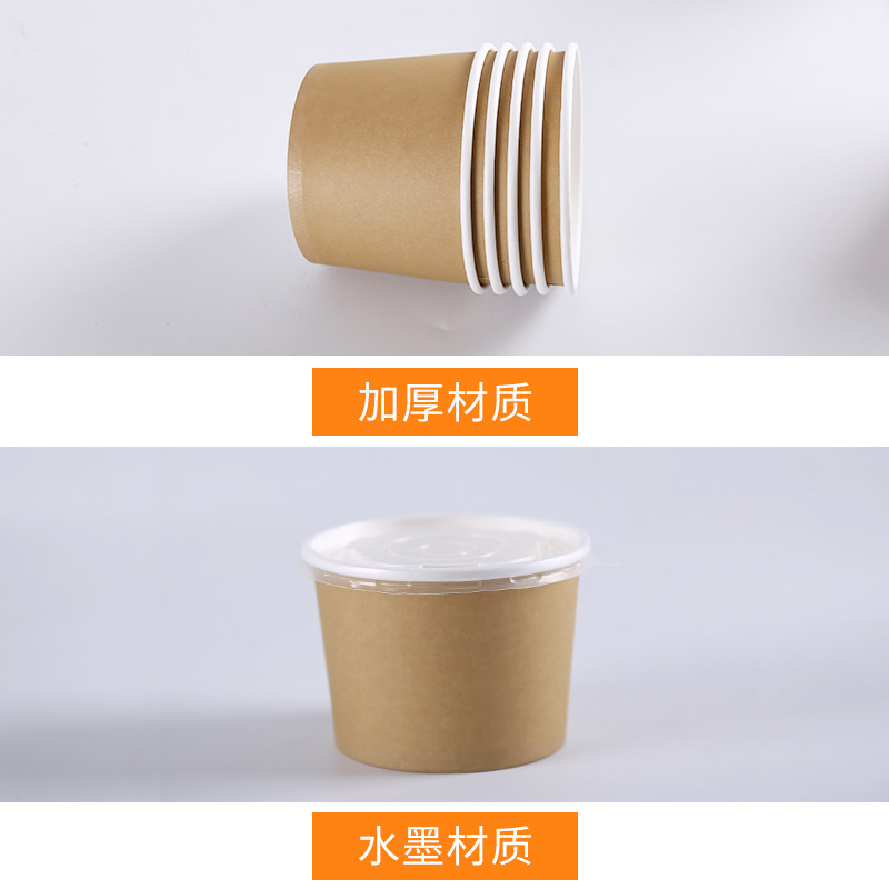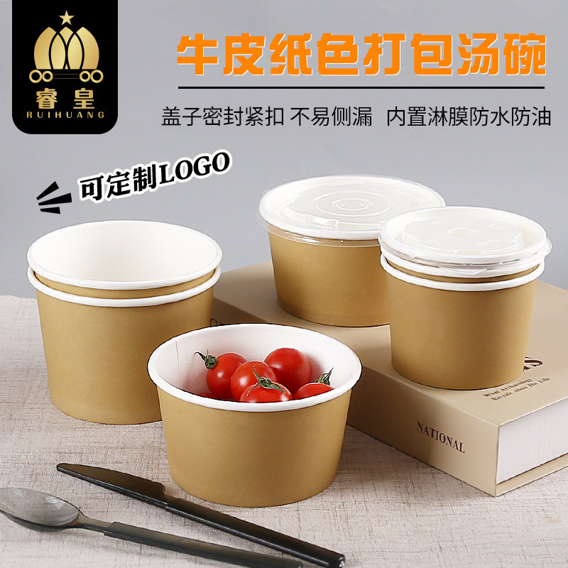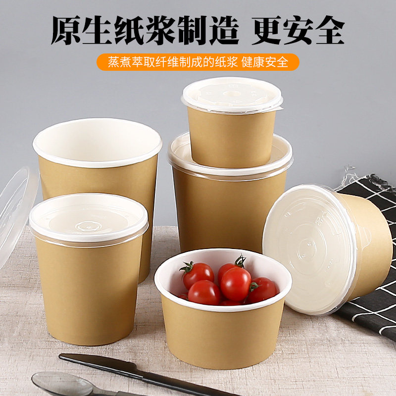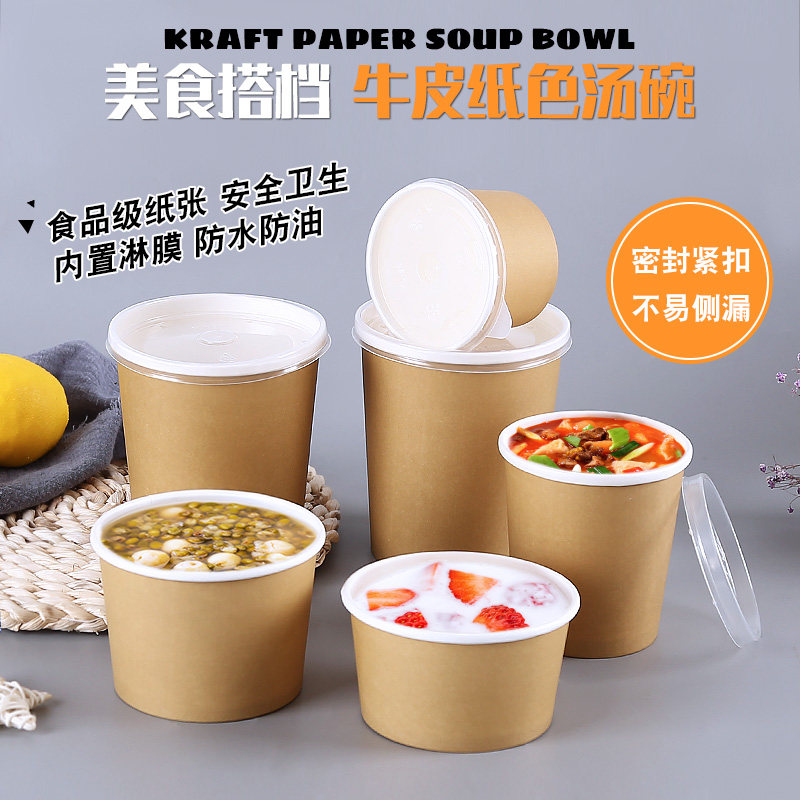 一次性牛皮纸餐具带盖汤碗快餐盒环保饭盒打包盒圆形1000ml外卖碗