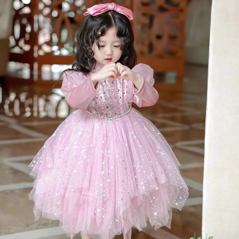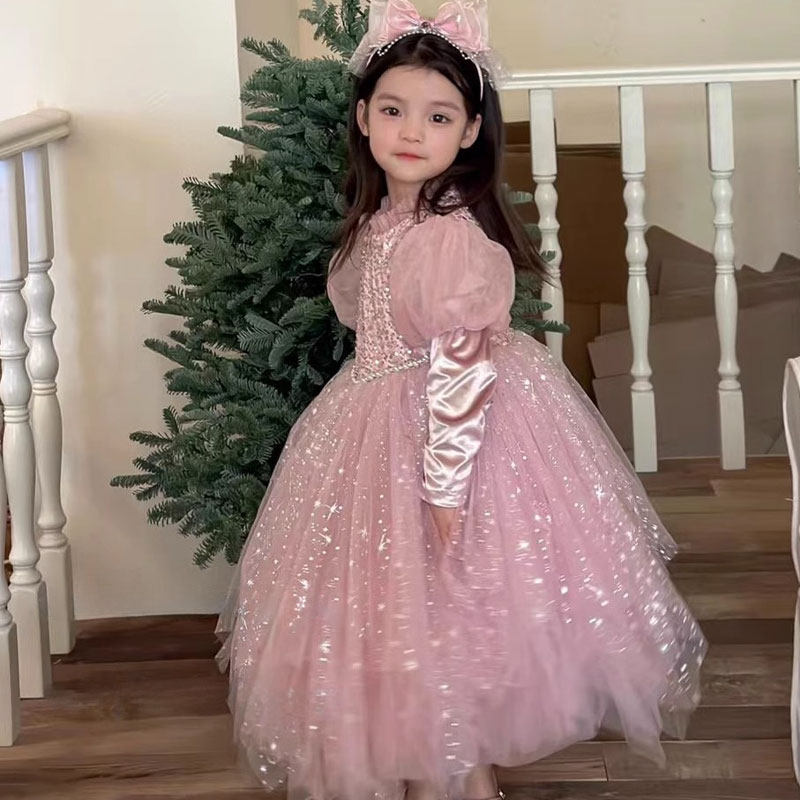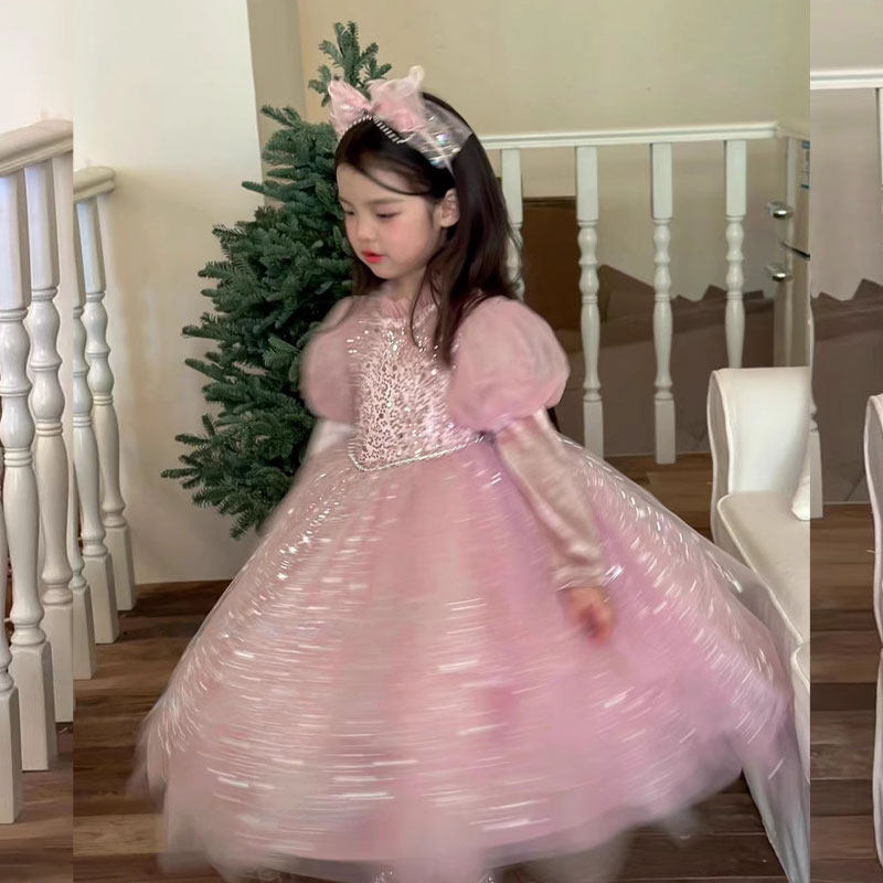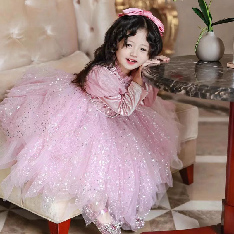 粉色满天星公主裙女童2025新款秋冬蓬蓬纱闪闪生日礼服儿童连衣裙