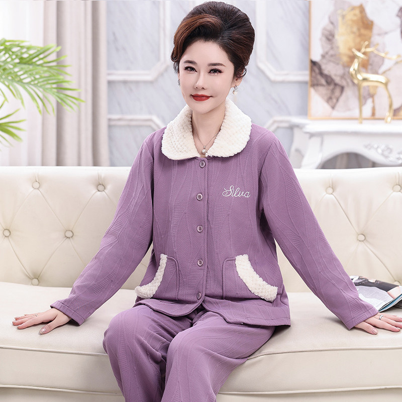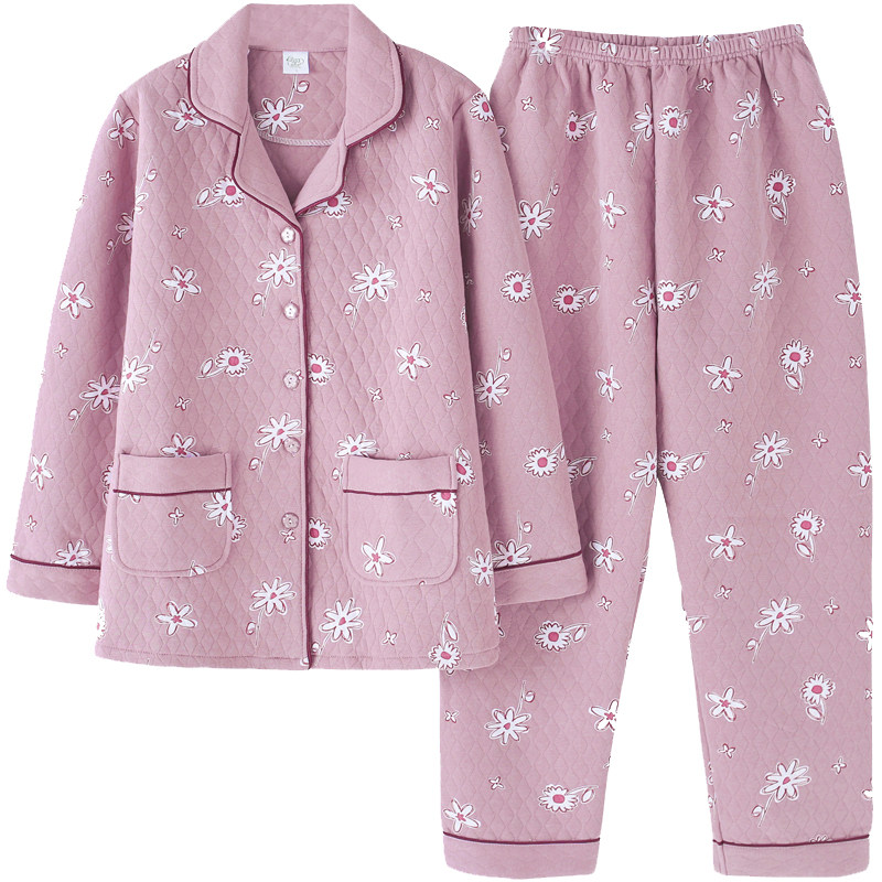妈妈睡衣女春秋季加厚纯棉长袖开衫中老年冬季空气棉夹层保暖套装