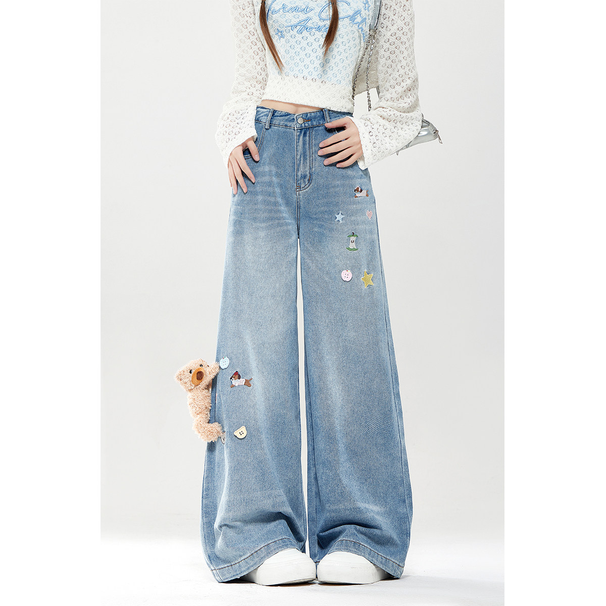 自然涩2026春季新款小熊牛仔裤女款早春穿搭宽松显瘦直筒阔腿裤子