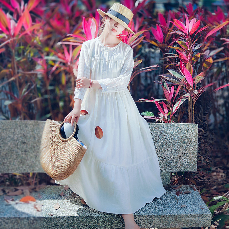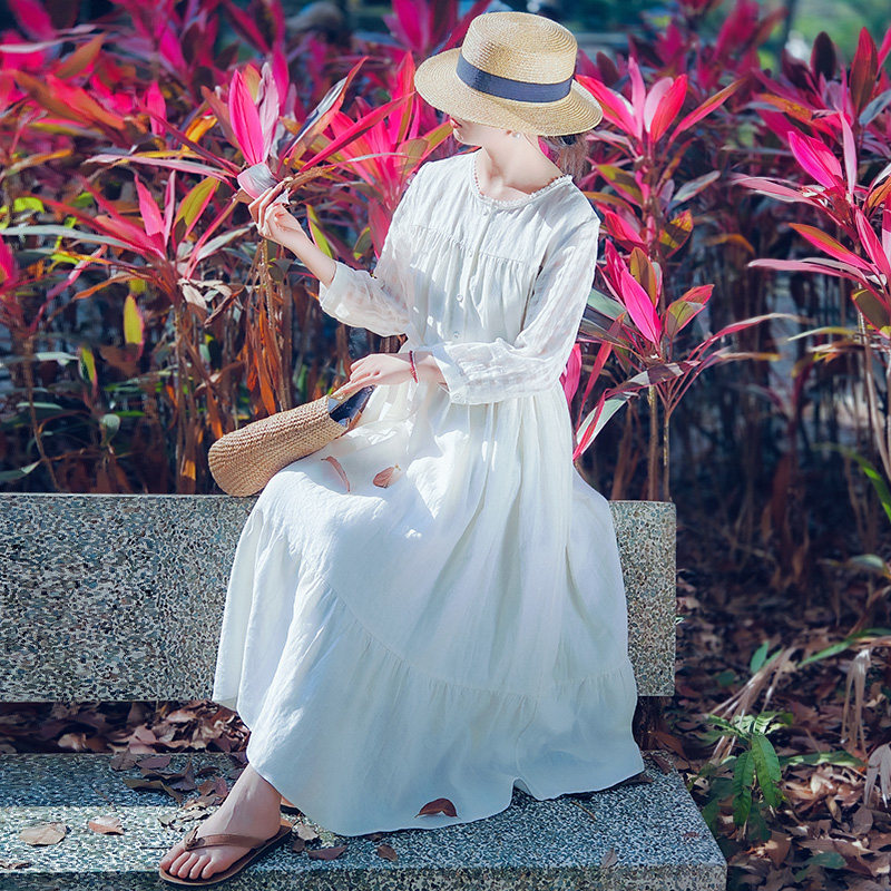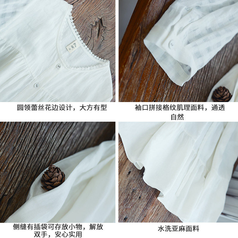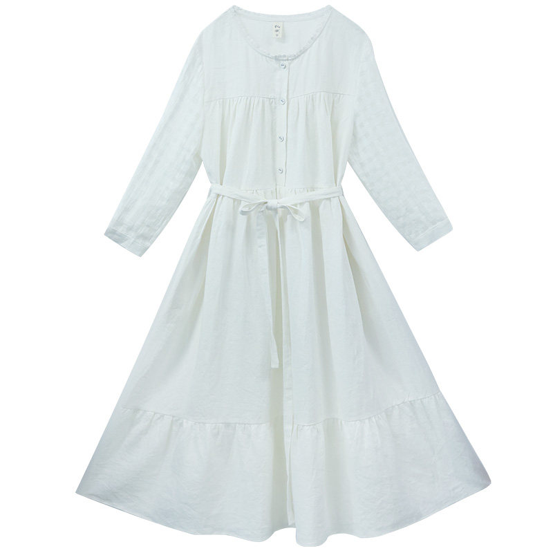 D现货【亭亭玉兰】文艺圆领白色连衣裙女夏格纹亚麻高腰仙气长裙