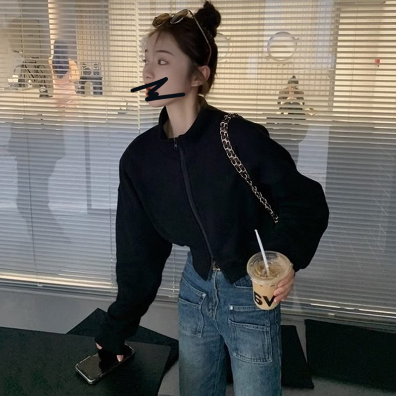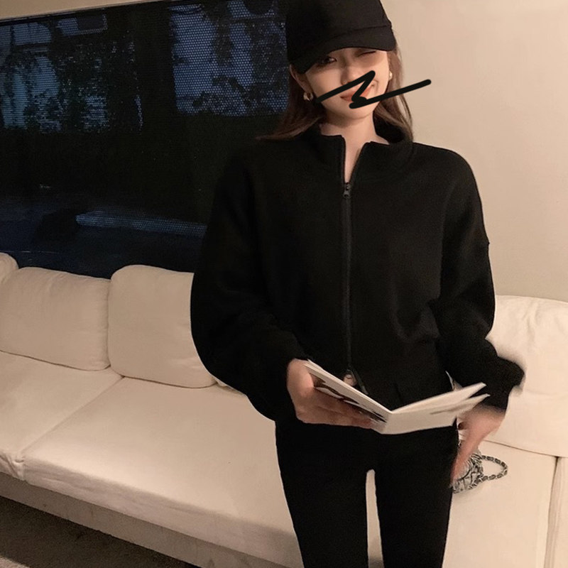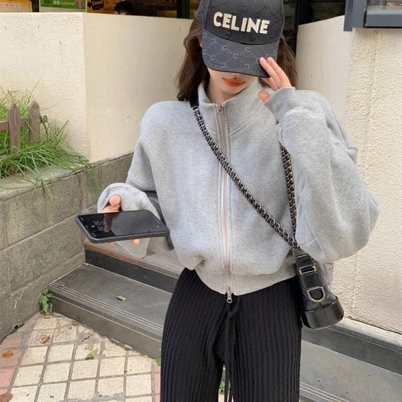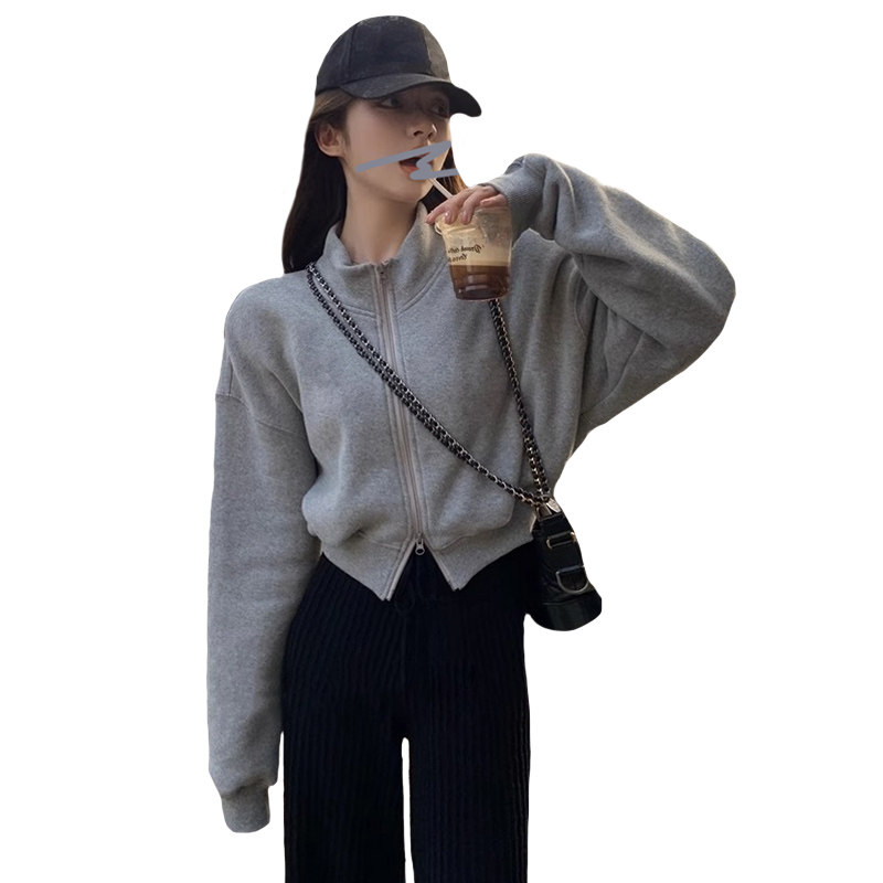 半高领灰色短款卫衣女款秋冬新款加绒加厚拉链开衫长袖小个子外套