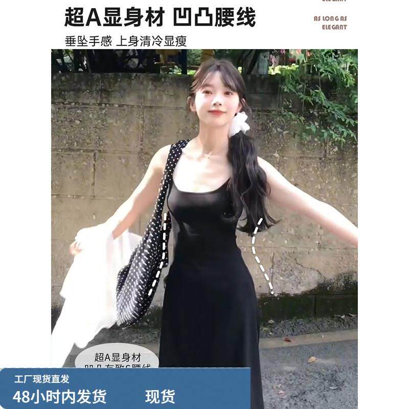 黑色吊带连衣裙长裙女初夏季2026巨好看无袖背心修身收腰a字裙子
