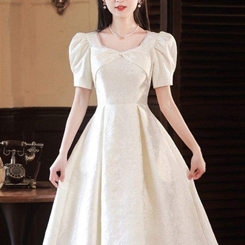 白色短袖连衣裙女法式高级感领证登记小白裙收腰小个子赫本风裙子