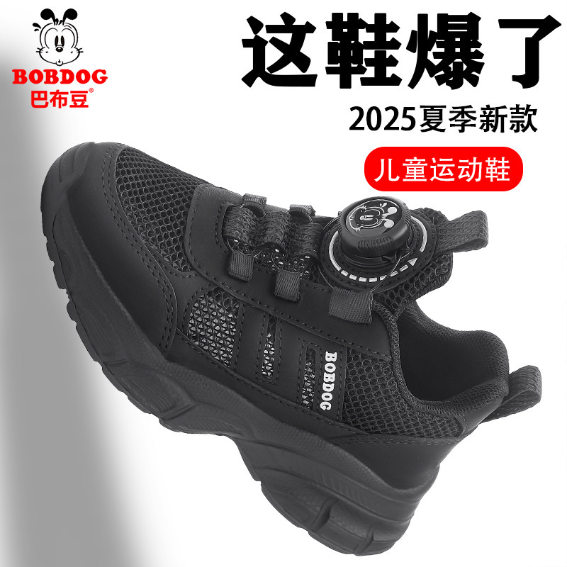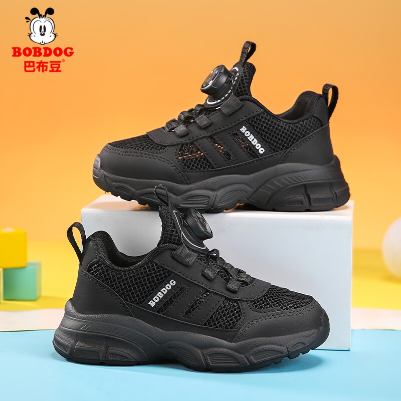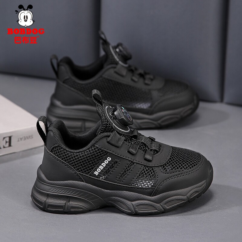巴布豆男女童黑色运动鞋夏季透气网面旋转纽扣小黑鞋中大童跑步鞋