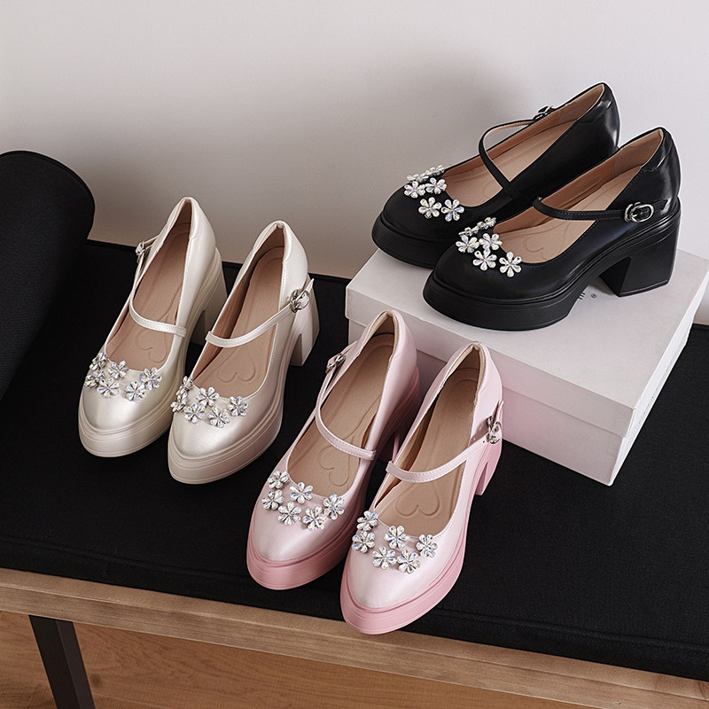 法式玛丽珍鞋女水钻一字扣厚底小个子增高12厘米高跟鞋粉色单鞋