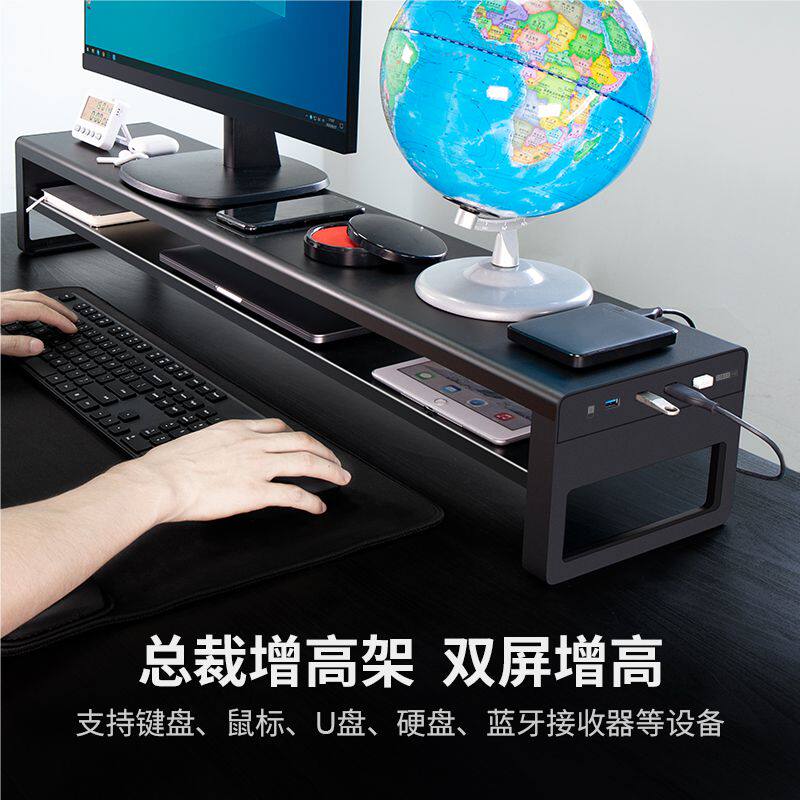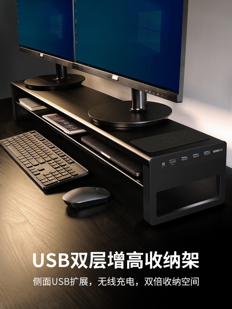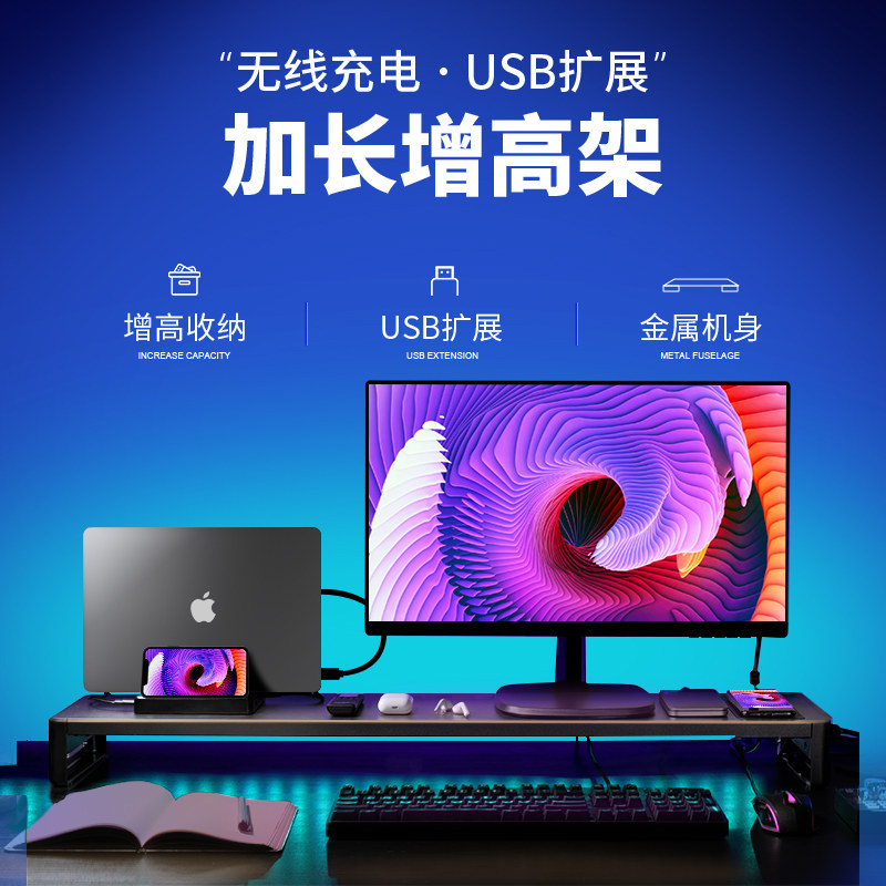 电脑显示器增高架加长带USB置物支架办公室台式屏幕桌面收纳底座双屏笔记本多功能无线充电架子金属铁艺