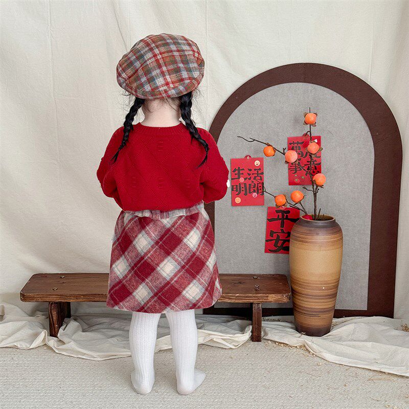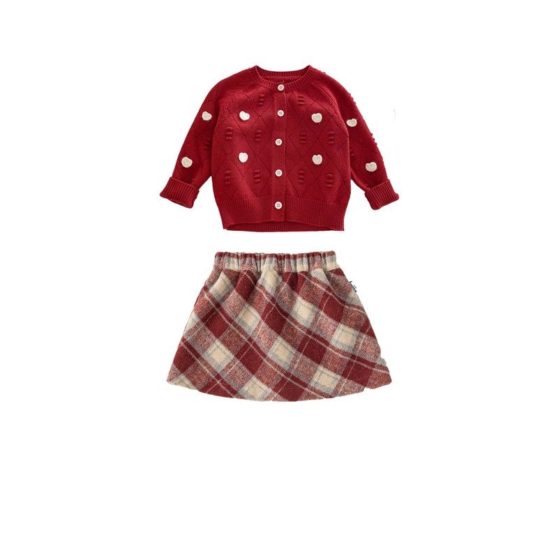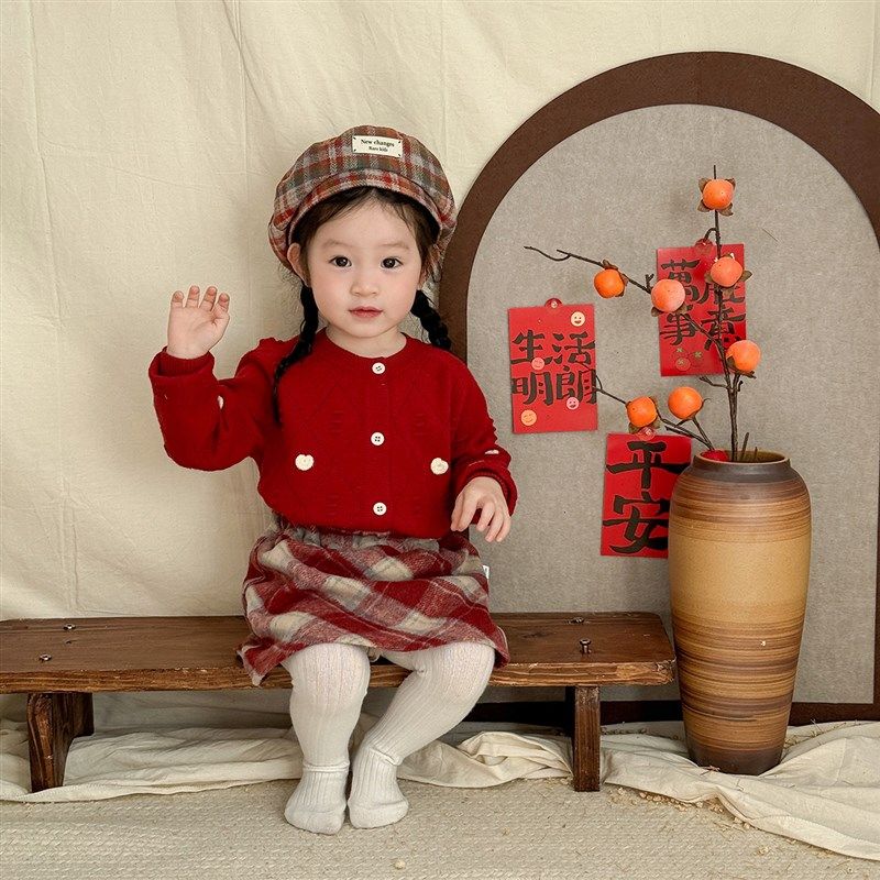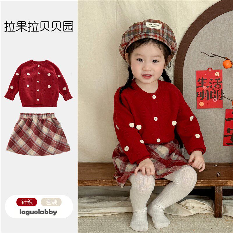 女童红色毛衣针织衫半身裙分体套装宝宝新年喜庆开衫短裙周岁礼服