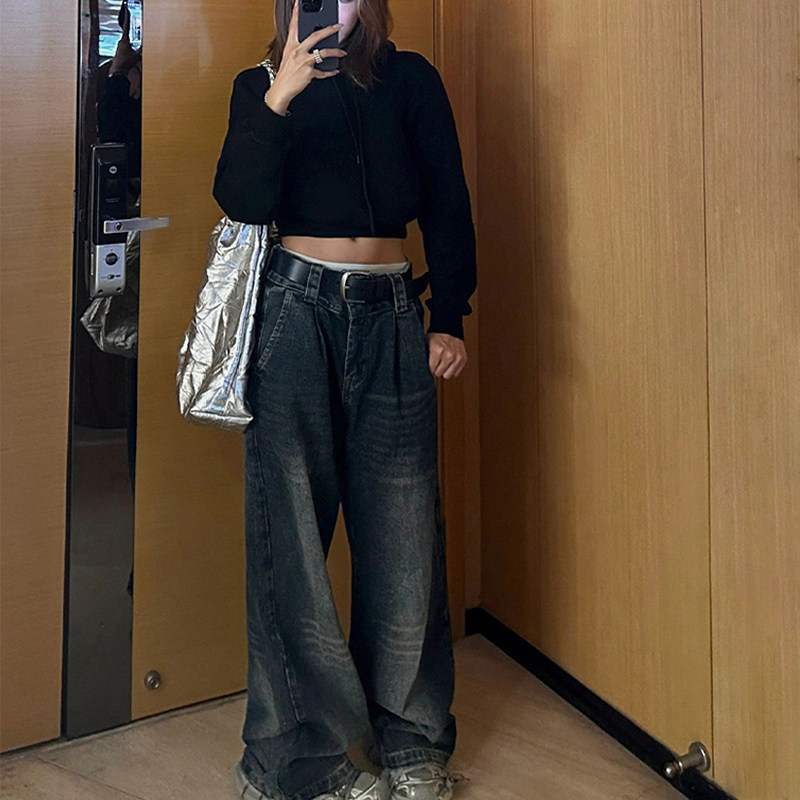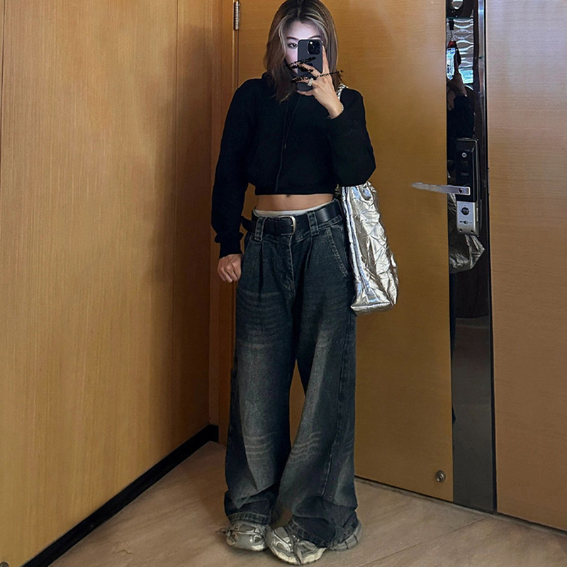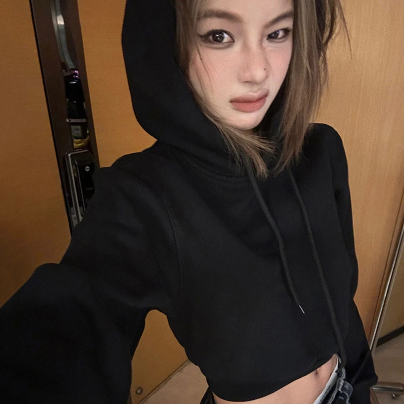超好看短款连帽黑色卫衣女款秋冬加绒加厚高腰套头宽松小个子上衣
