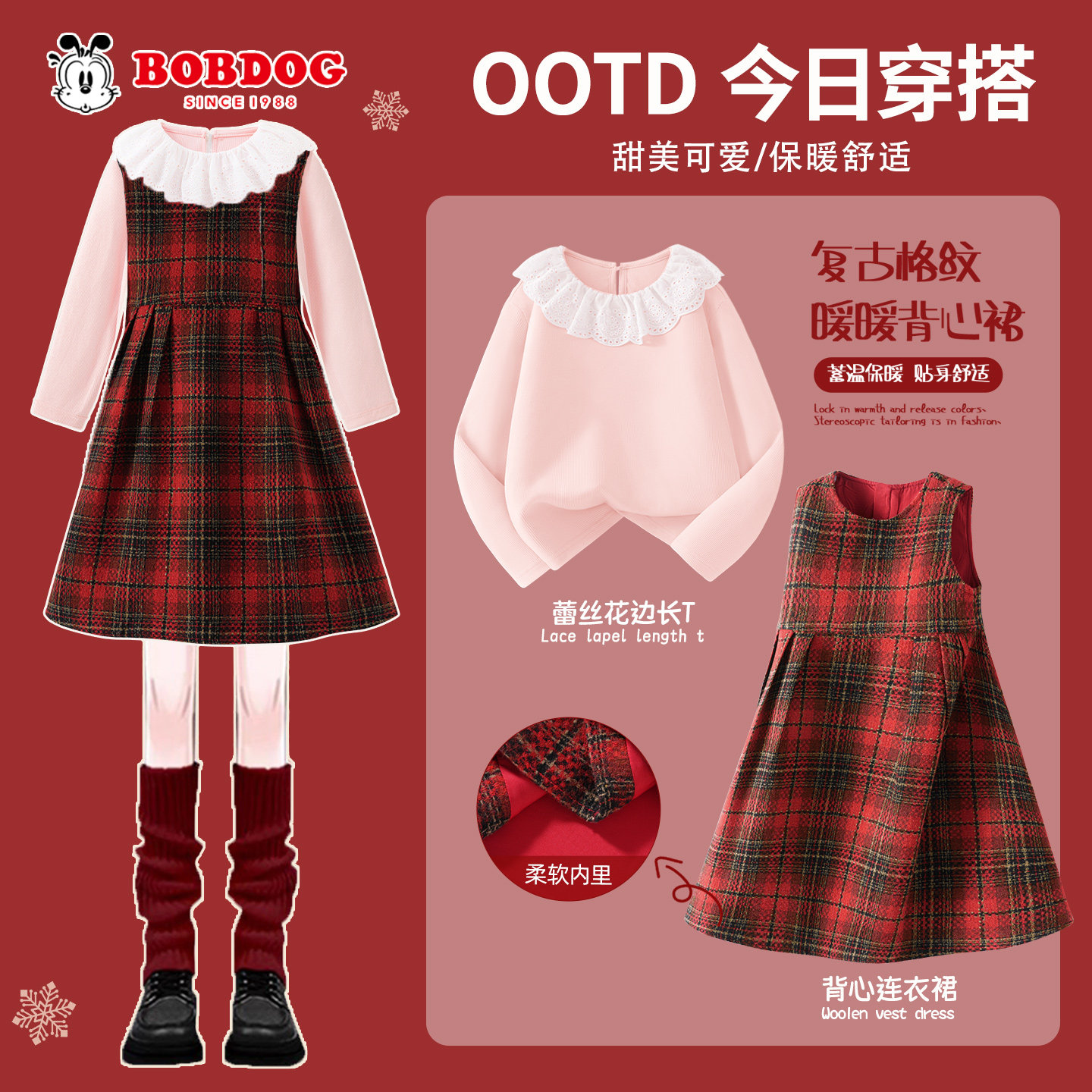 巴布豆卡乐女童套装新年连衣裙2026新款儿童冬季红裙子拜年服女宝