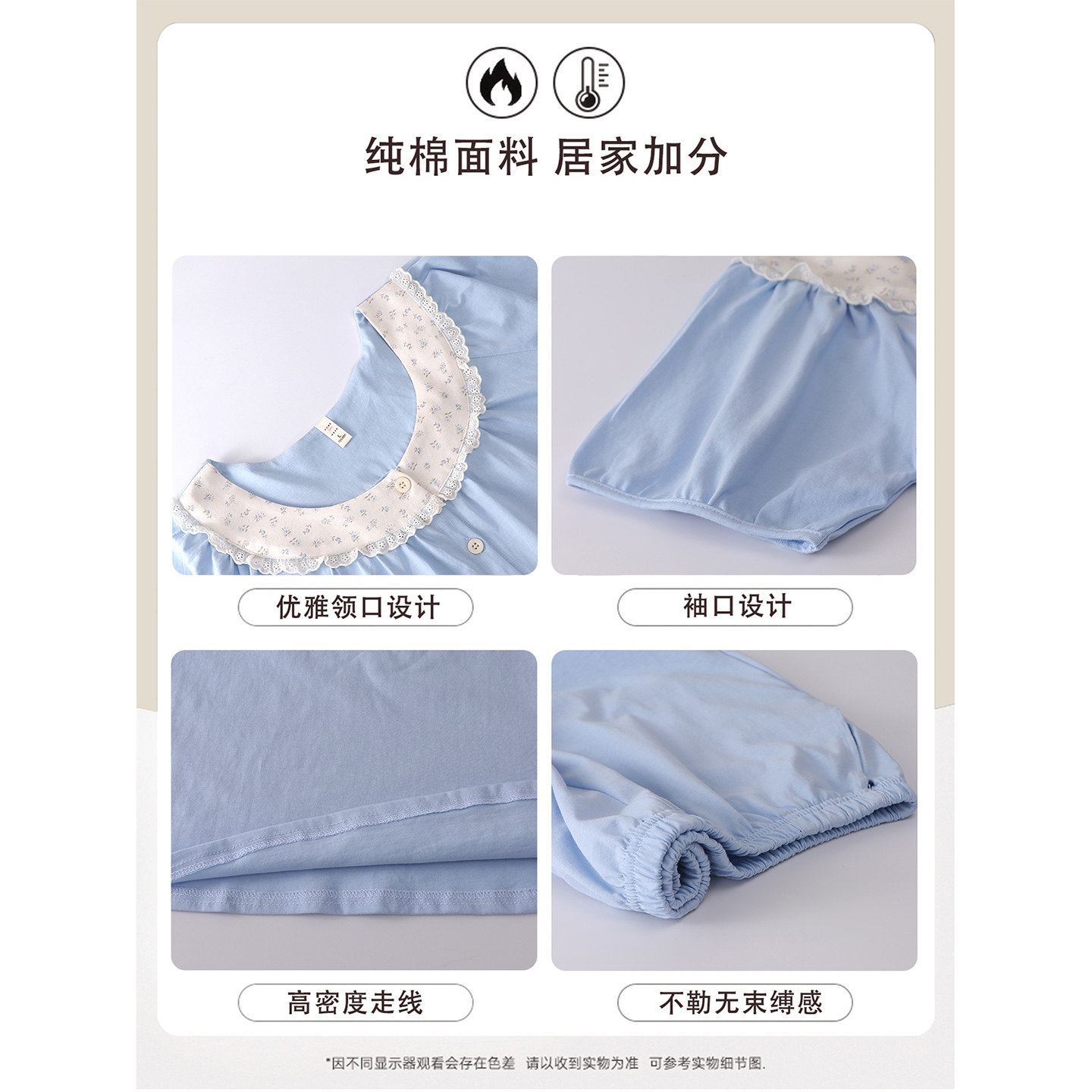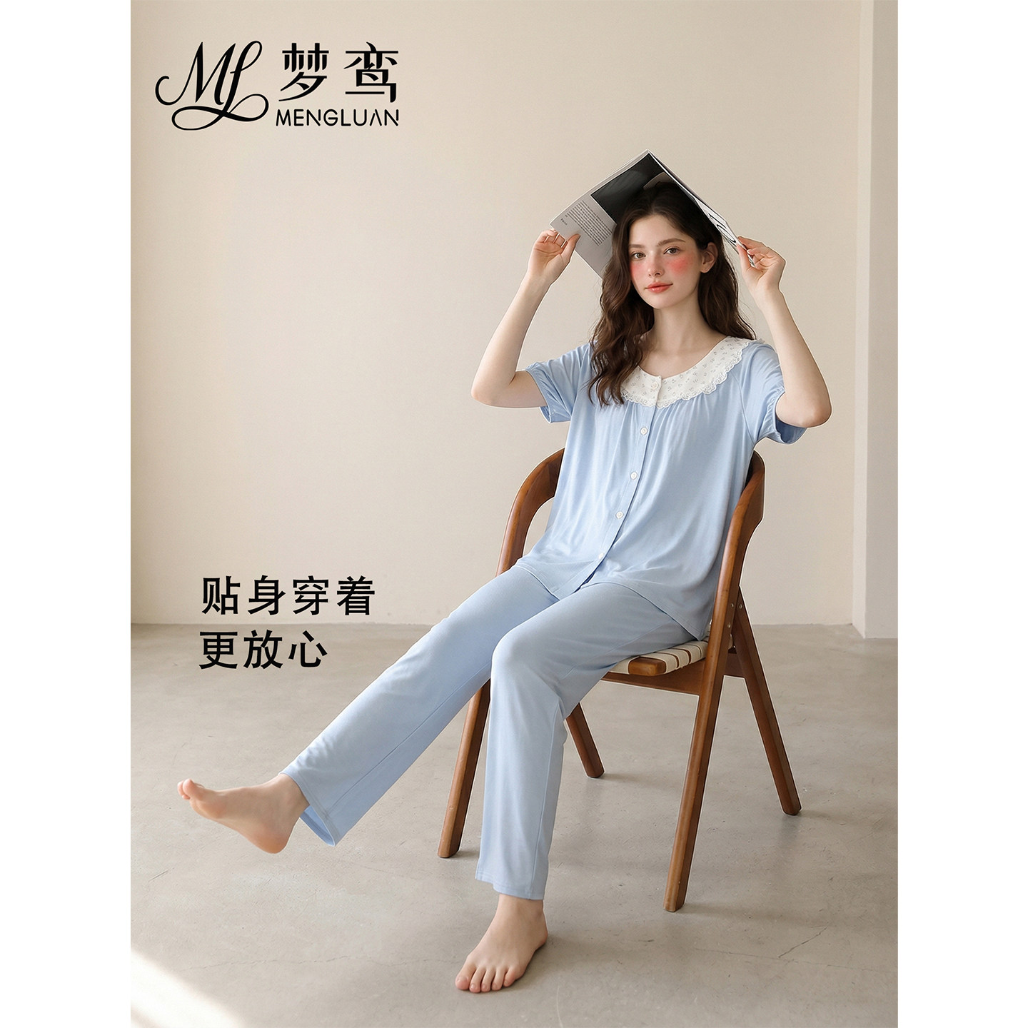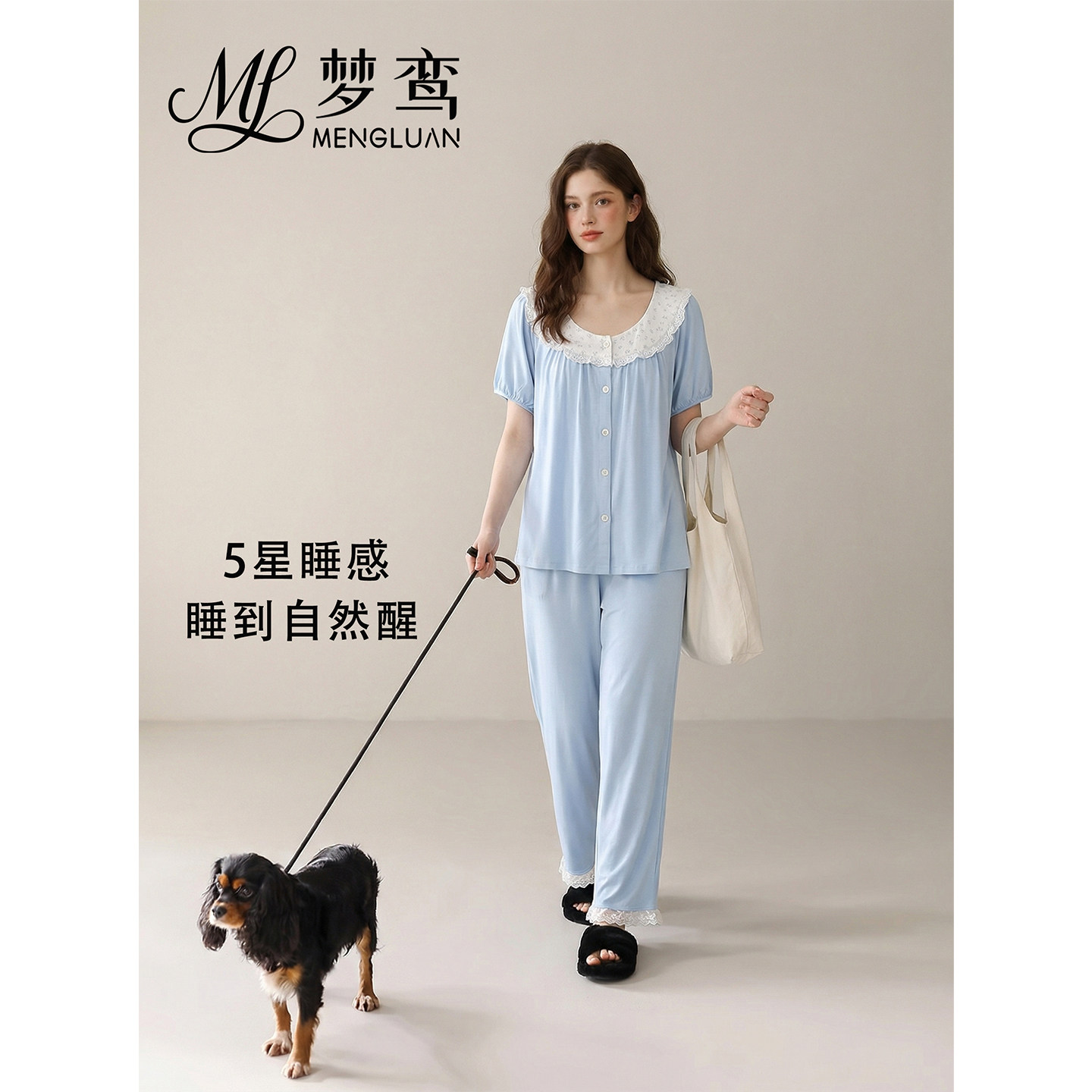 梦鸾纯棉女款睡衣夏季甜美花边短袖上衣长裤可外穿女士家居服套装
