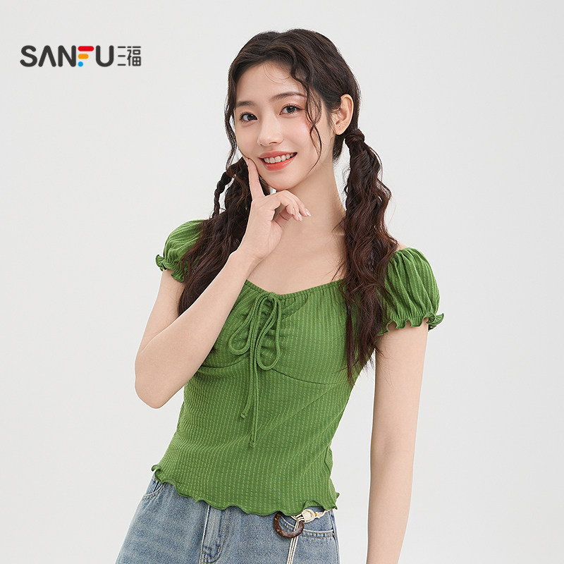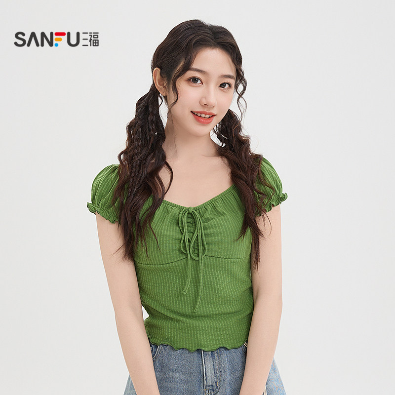 三福短袖T恤女2026新款夏季小个子V领紧身短款绿色上衣女装521881