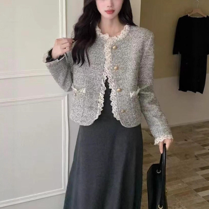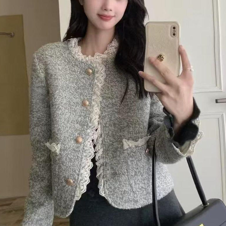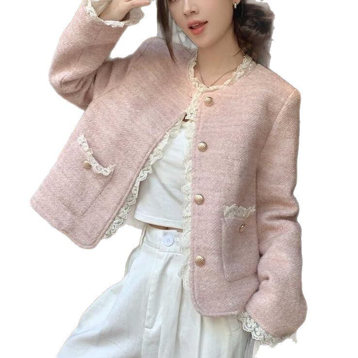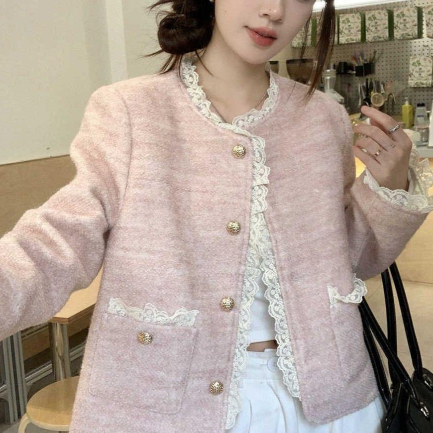 大码胖mm粉色小香风外套女2026春季新款蕾丝拼接气质加厚短款上衣