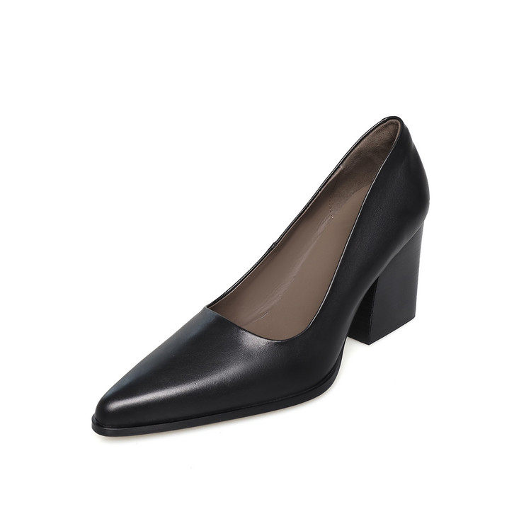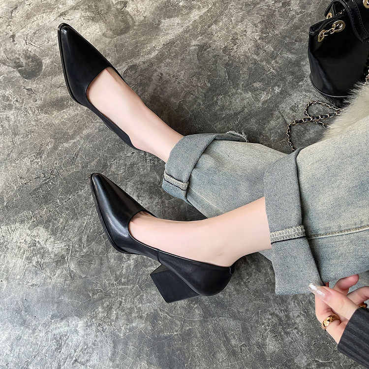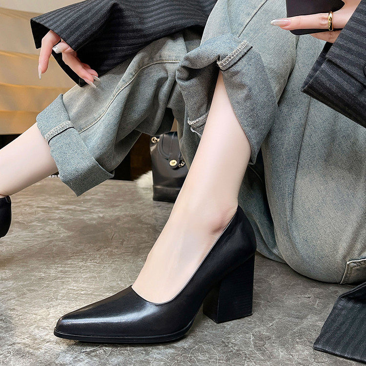2025春夏新款真皮气质尖头浅口粗跟高跟通勤百搭黑色气质单鞋女鞋