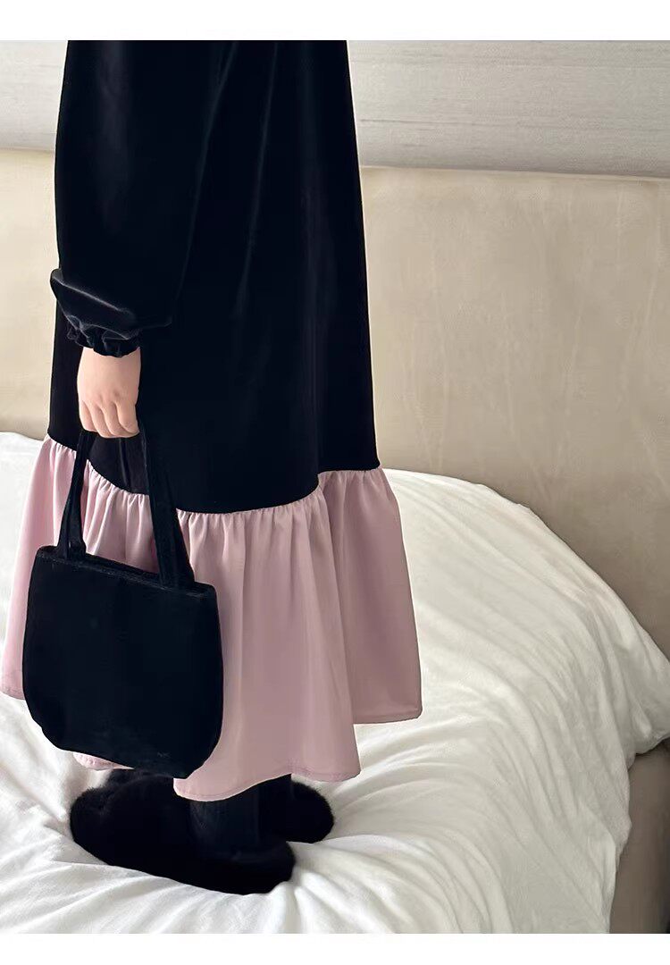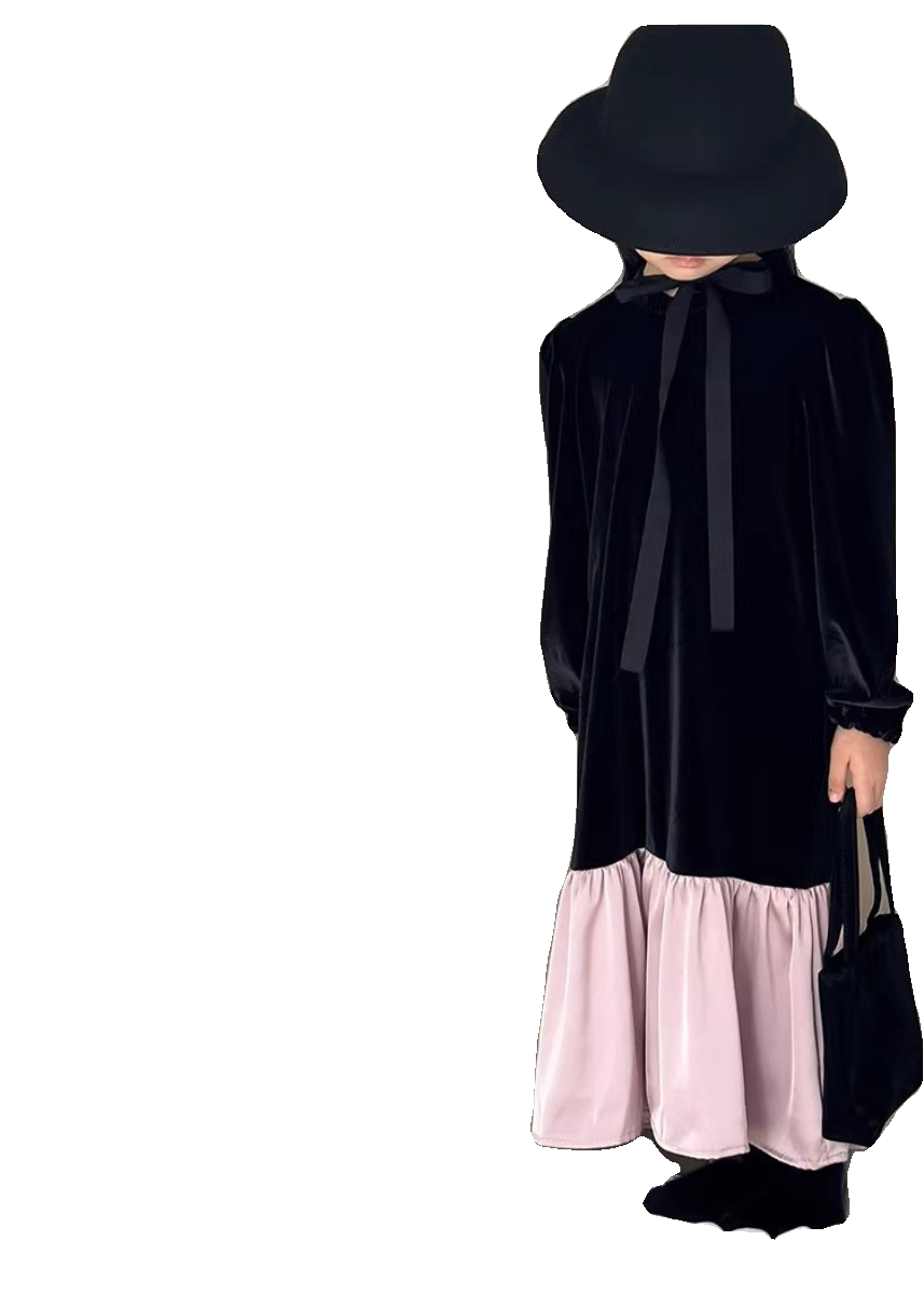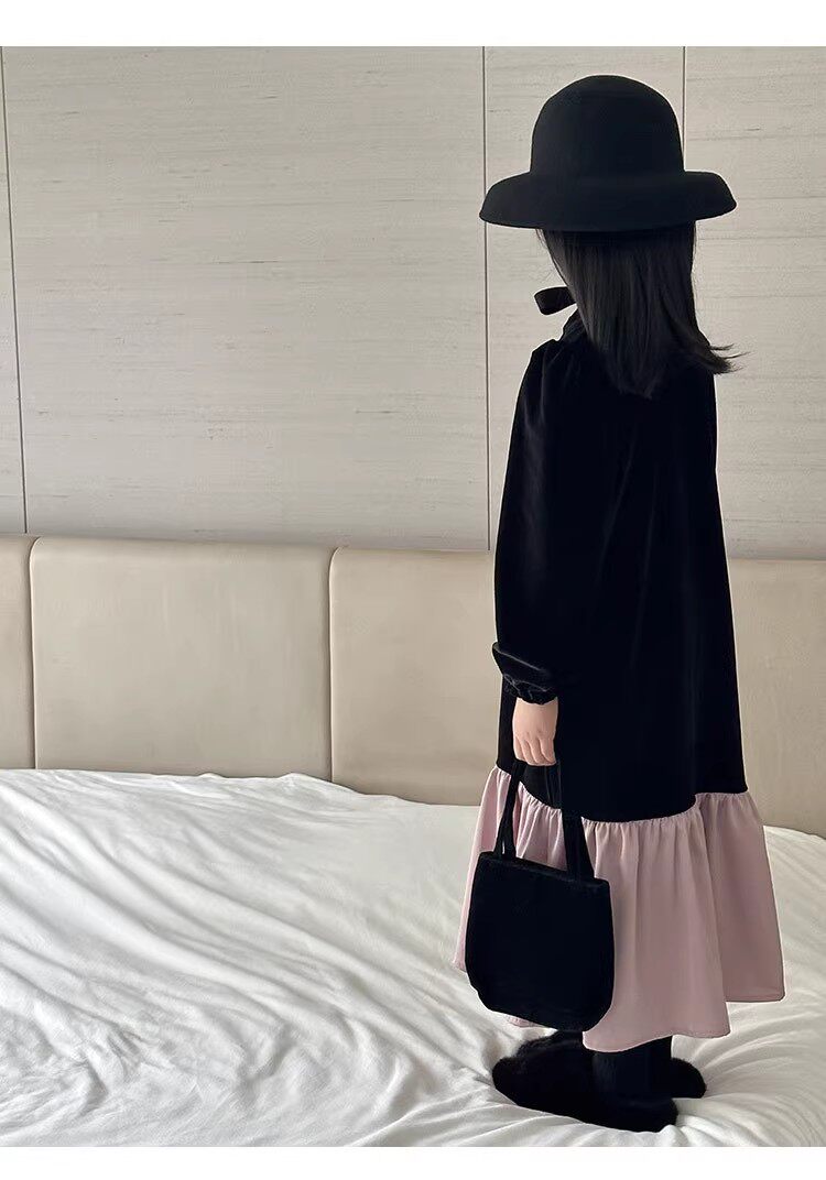 春秋冬新款女童丝绒连衣裙长袖小中大童拼接宽松气质长裙