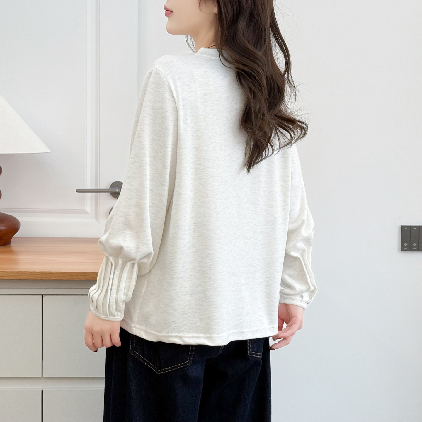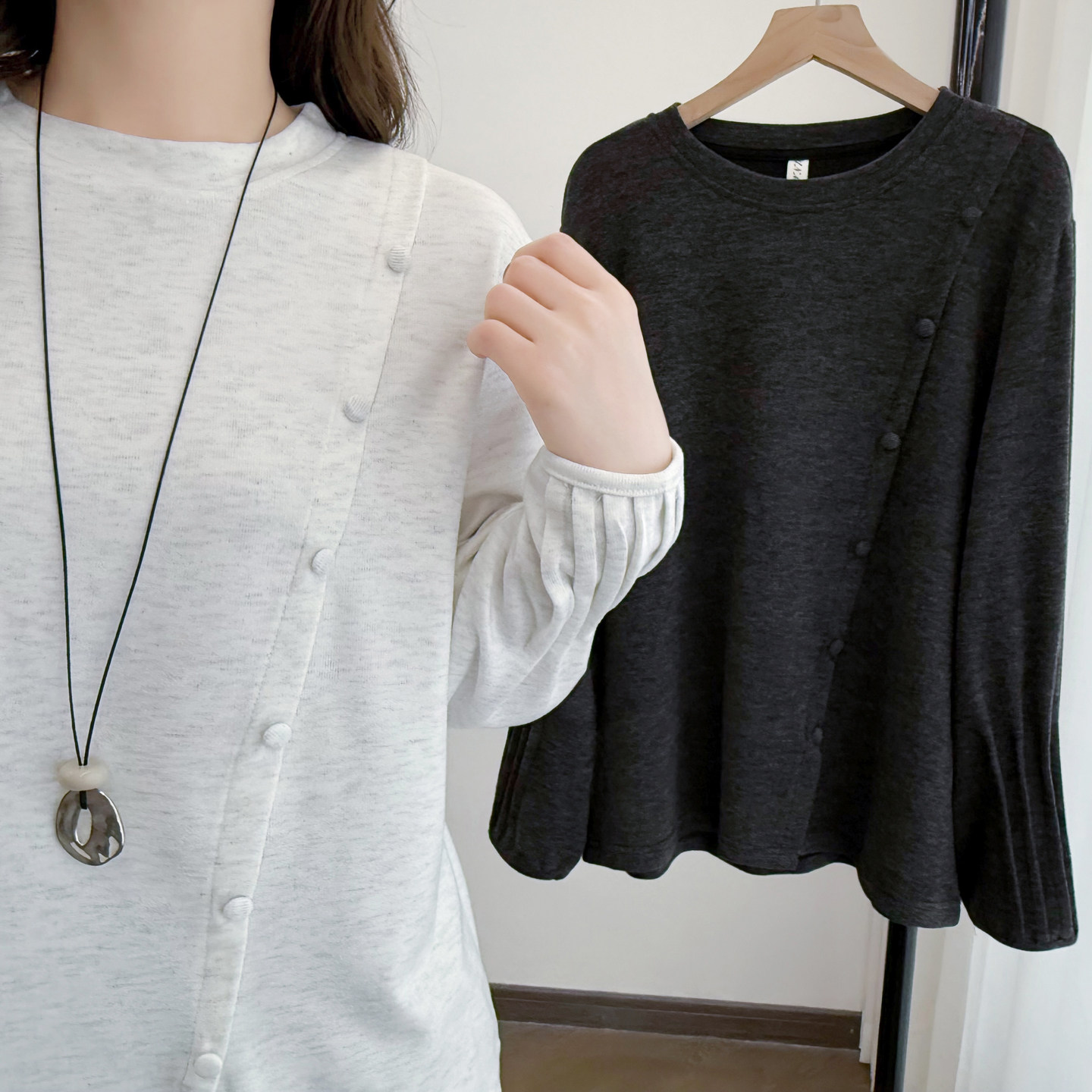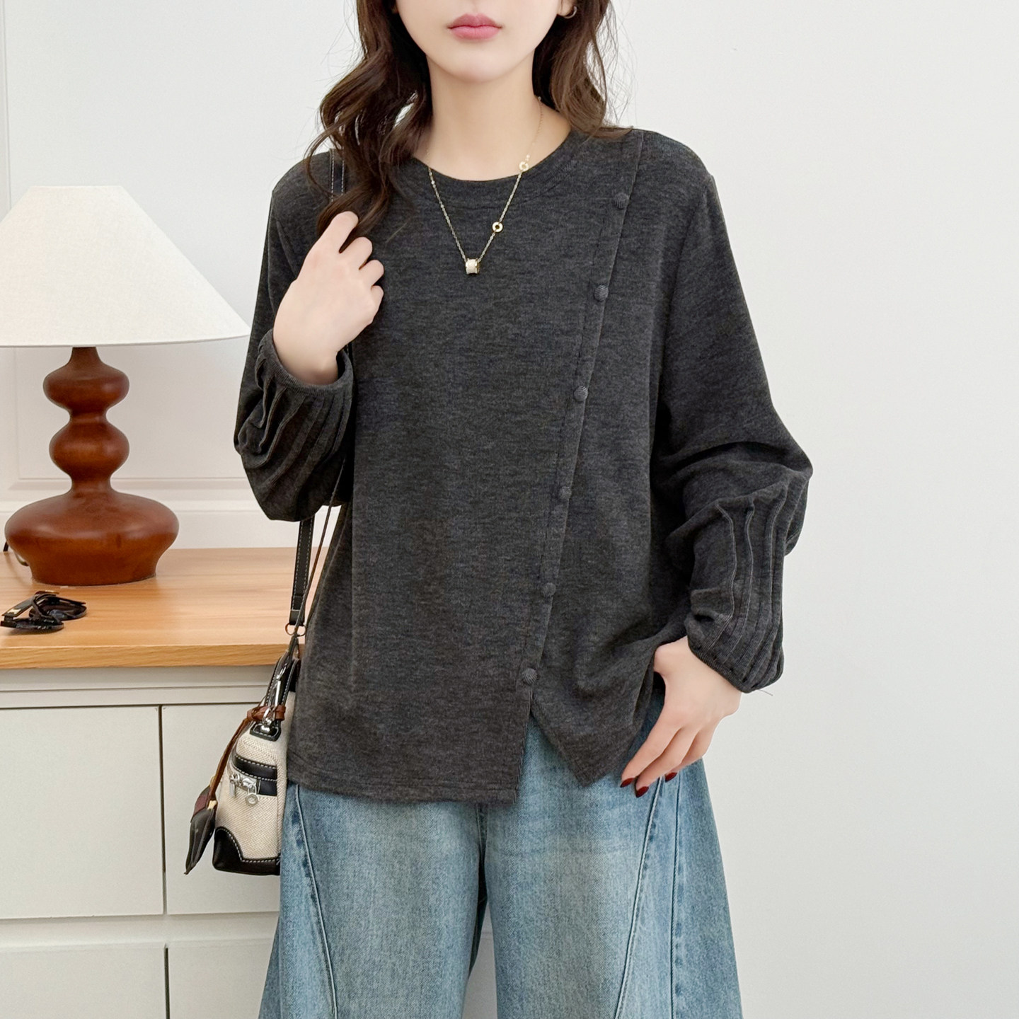 早春上衣大码女2026新款胖mm200斤时尚褶皱袖拼接开叉长袖打底衫