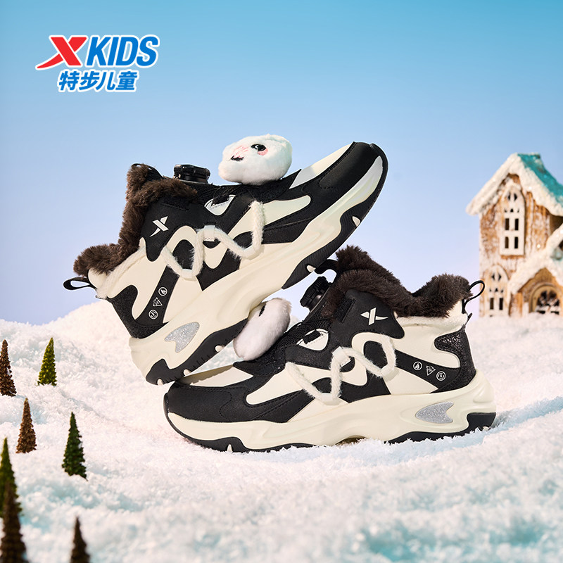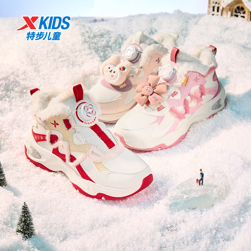 特步童鞋冬季新款女童中大童运动休闲高帮加绒防滑耐磨旋转扣棉鞋