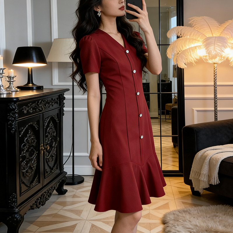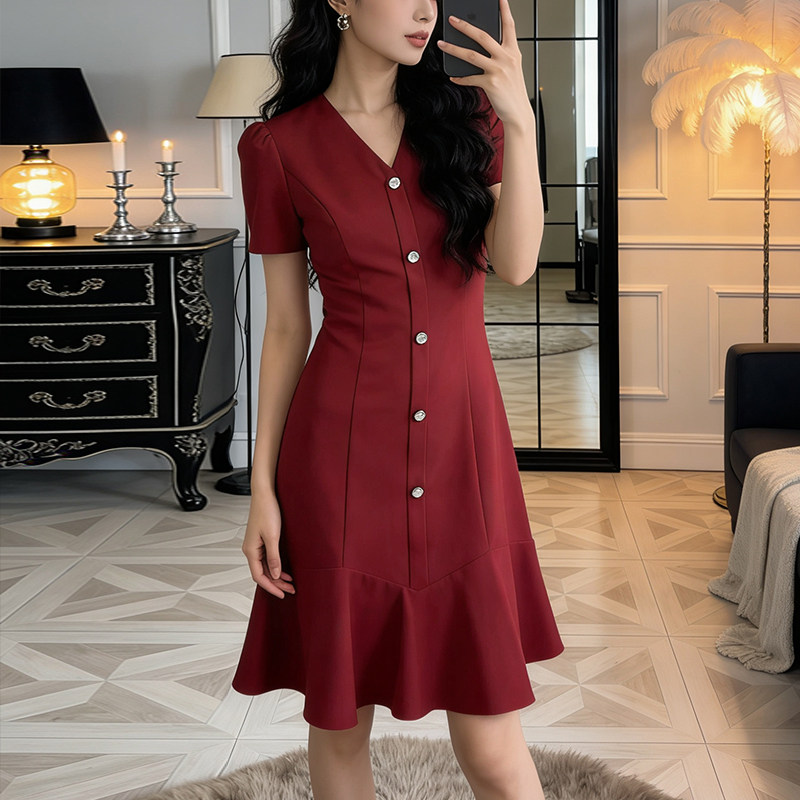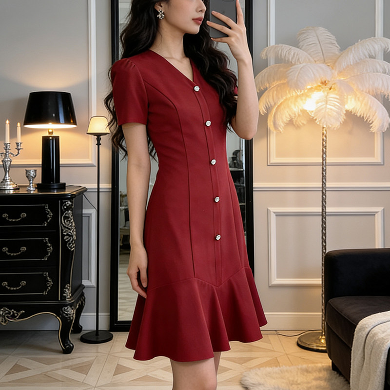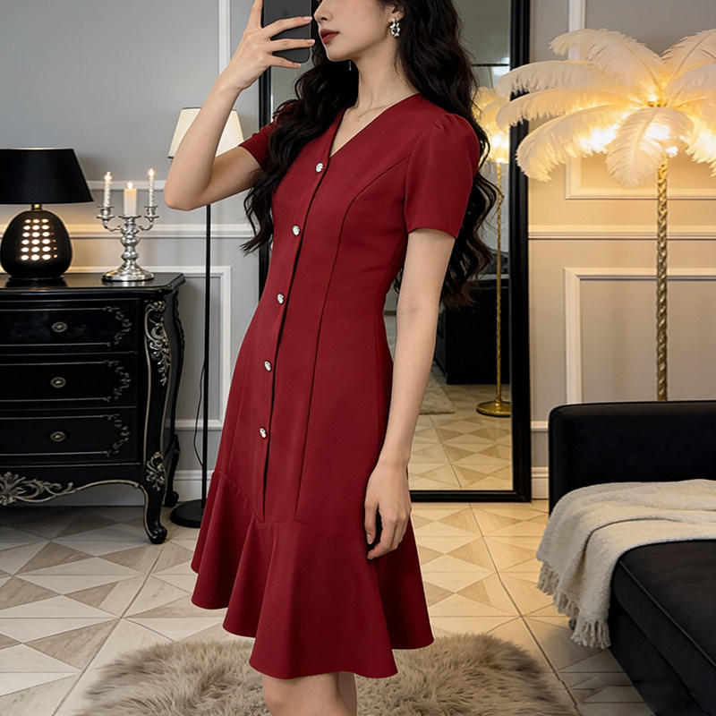 赫本风高级感红色女短袖连衣裙2026夏季新款法式收腰显瘦轻奢裙子