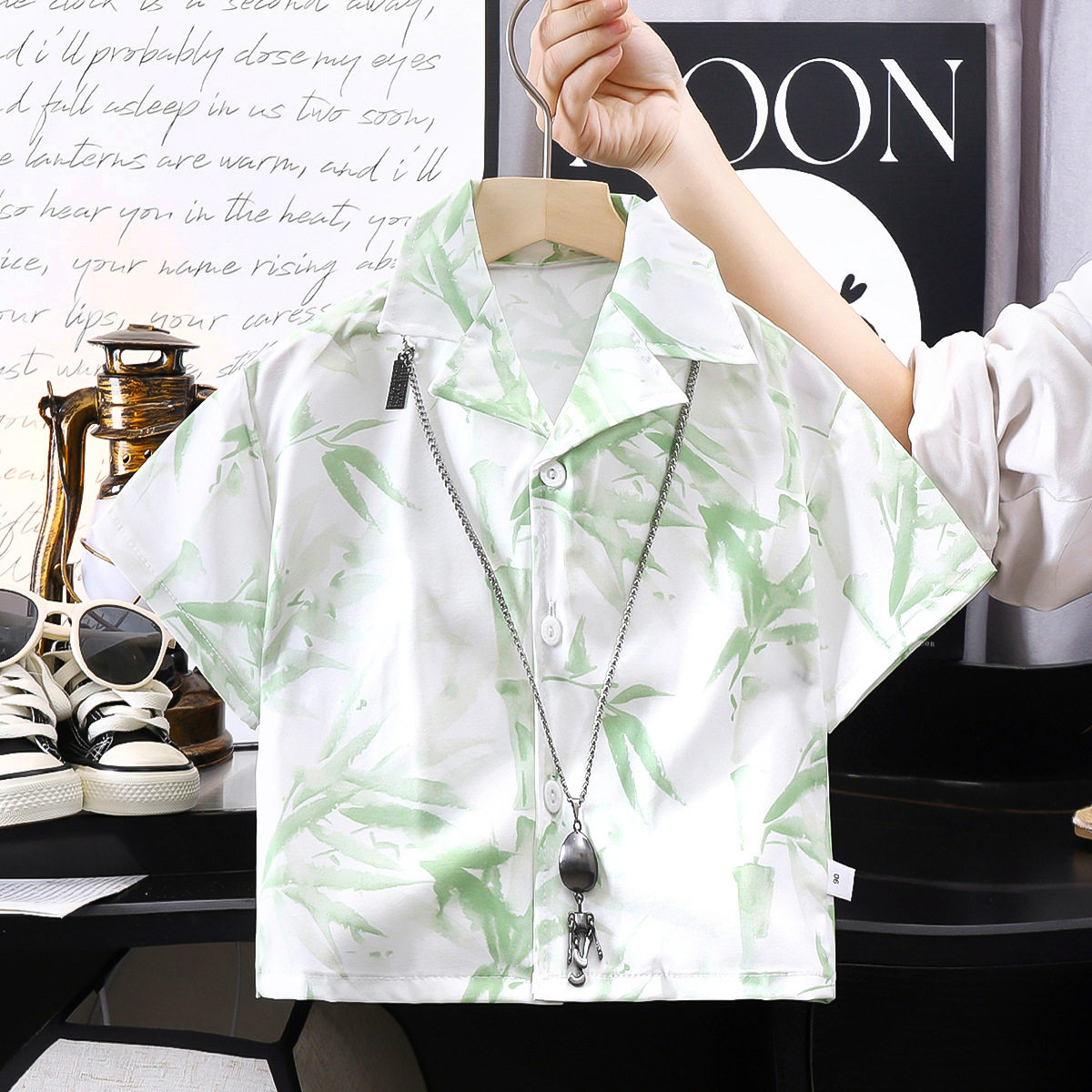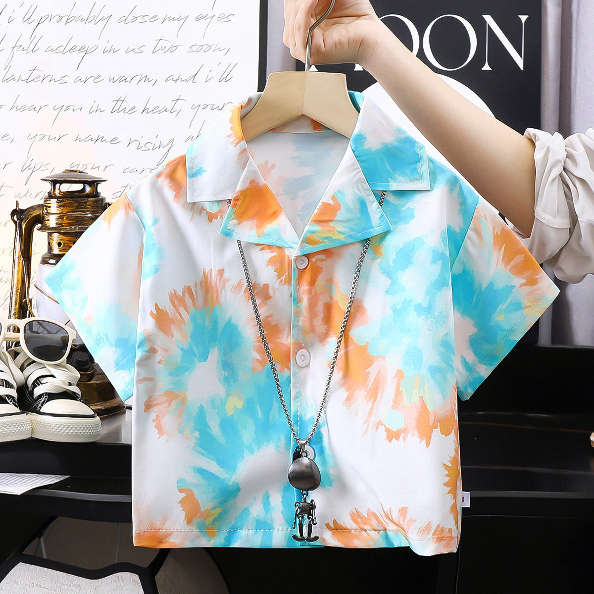 夏季儿童时尚短袖衬衫男童百搭沙滩花衬衣宝宝洋气翻领开衫上衣潮