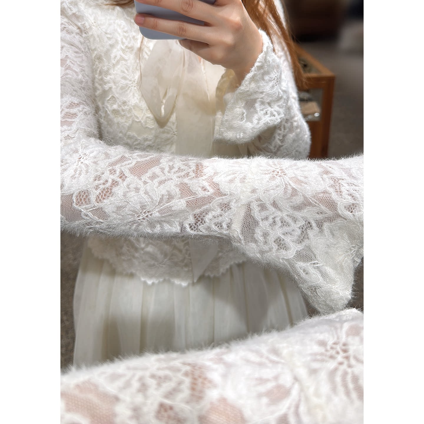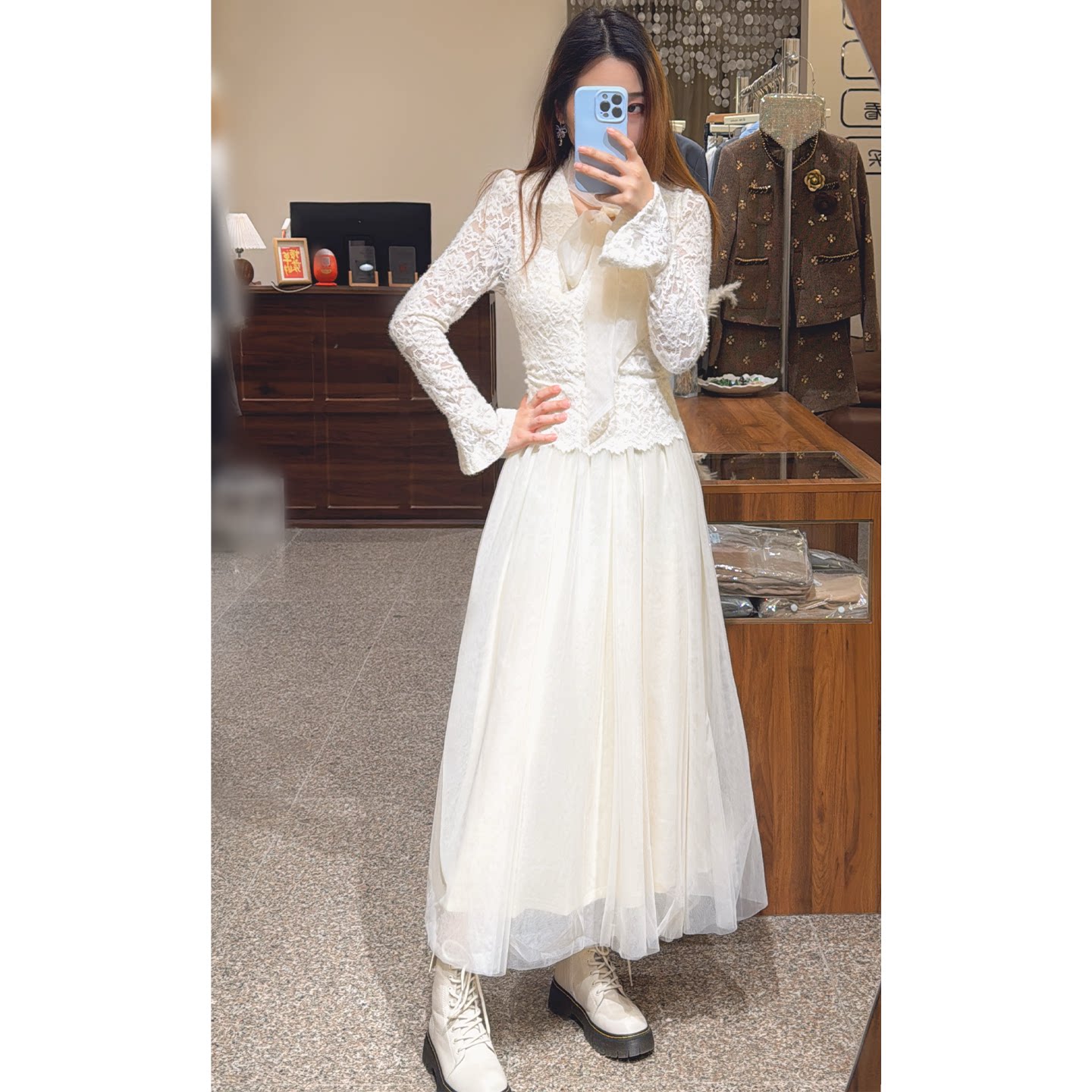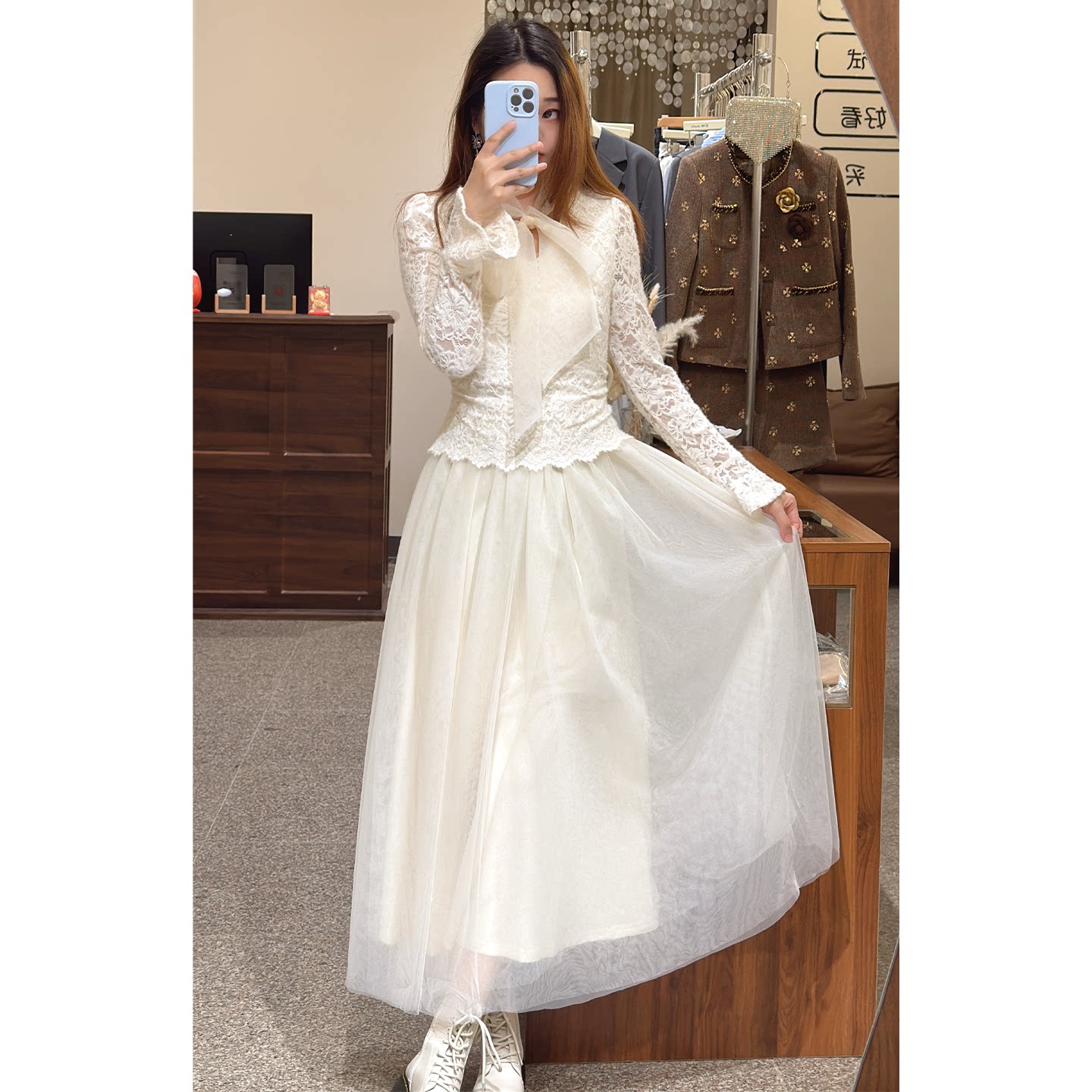 国风加绒里布白色蕾丝连衣裙女长袖收腰显瘦长裙仙气飘逸