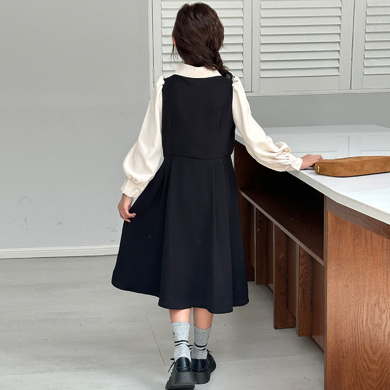 高品质女童春秋假两件连衣裙女中长裙黑白撞色收腰叠穿高级感裙子