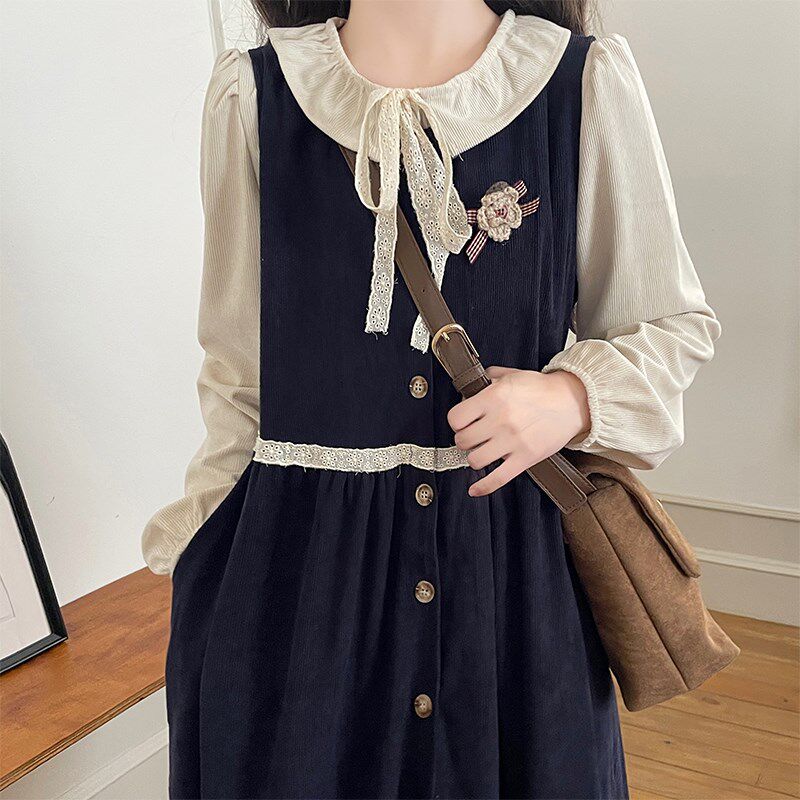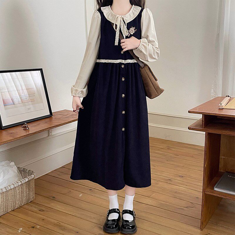 初中女生娃娃领长袖衬衣背心裙套装高中学生秋冬甜美灯芯绒连衣裙