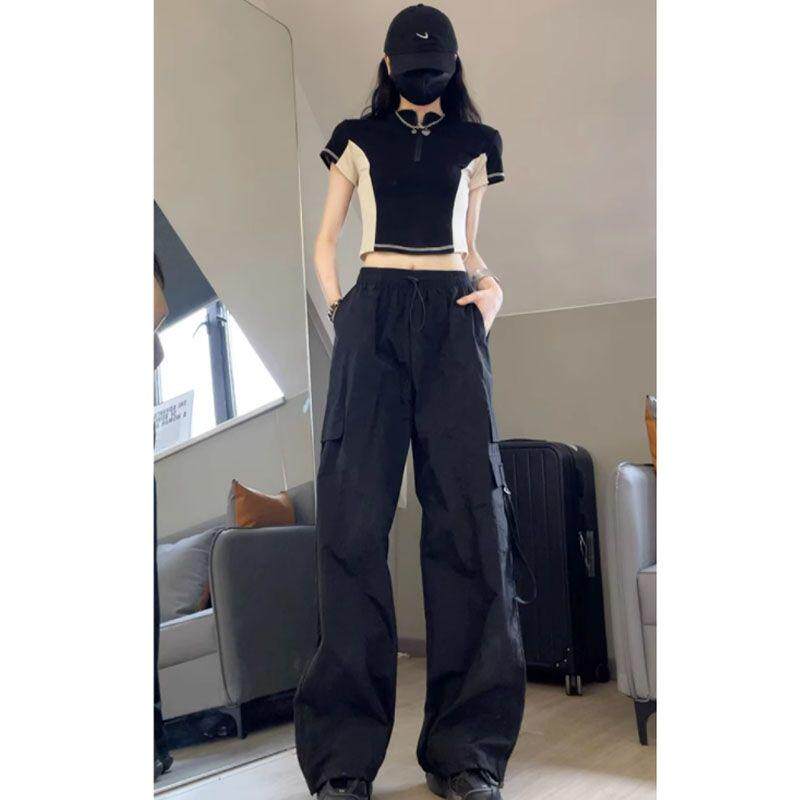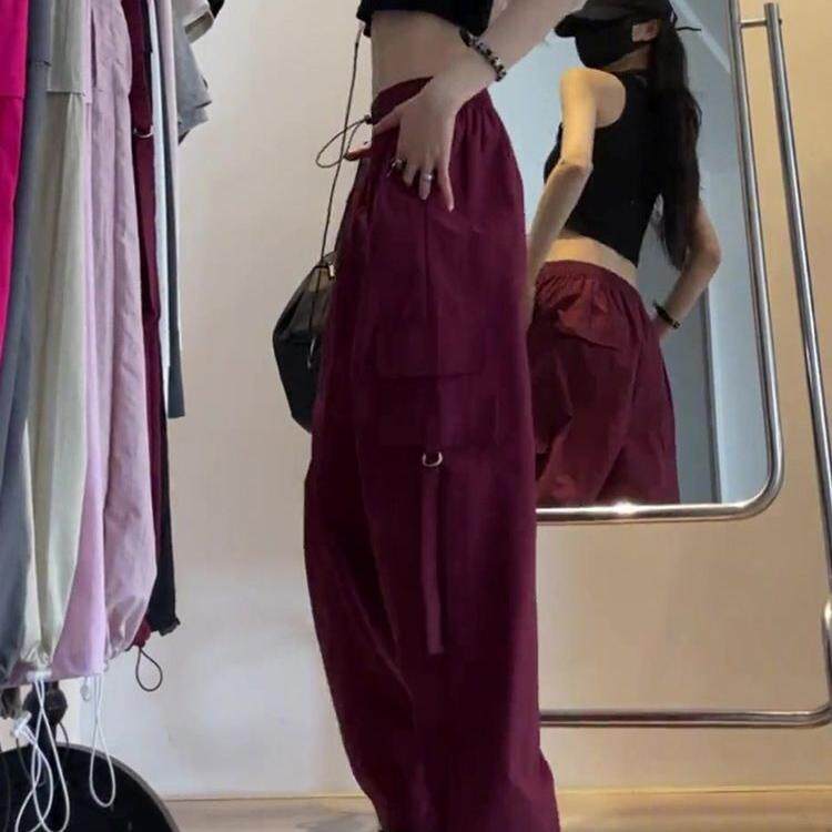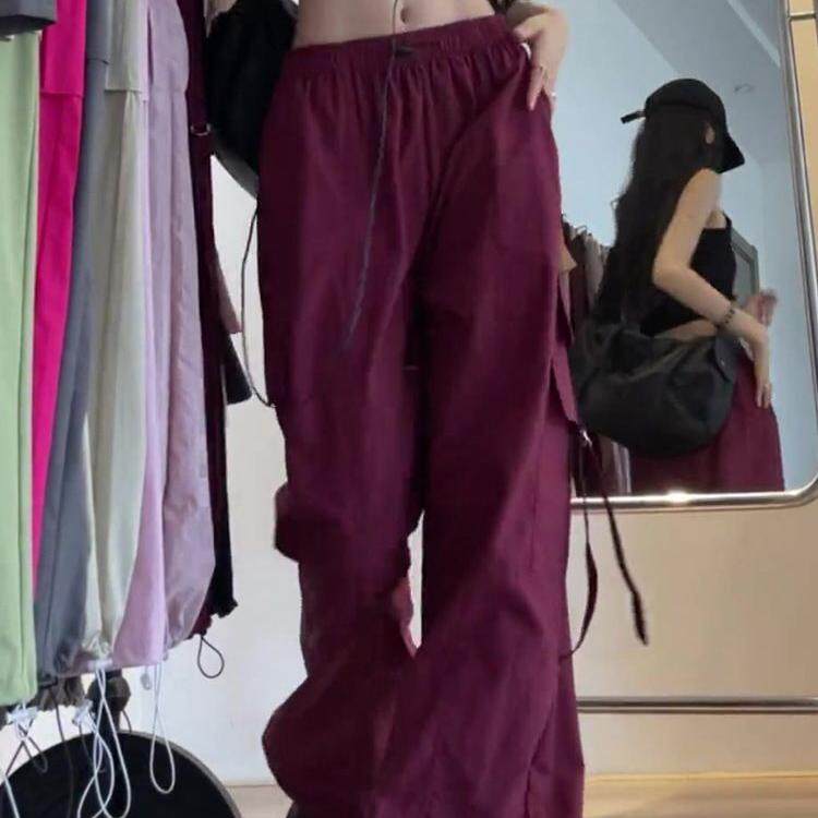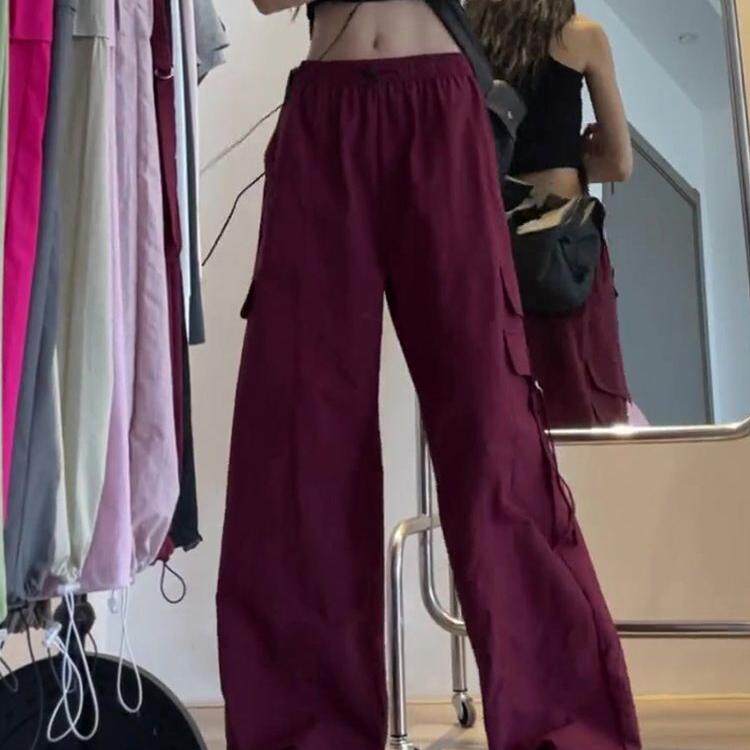 红色工装裤女款秋季薄款高腰小个子2025新款美式速干运动阔腿裤子