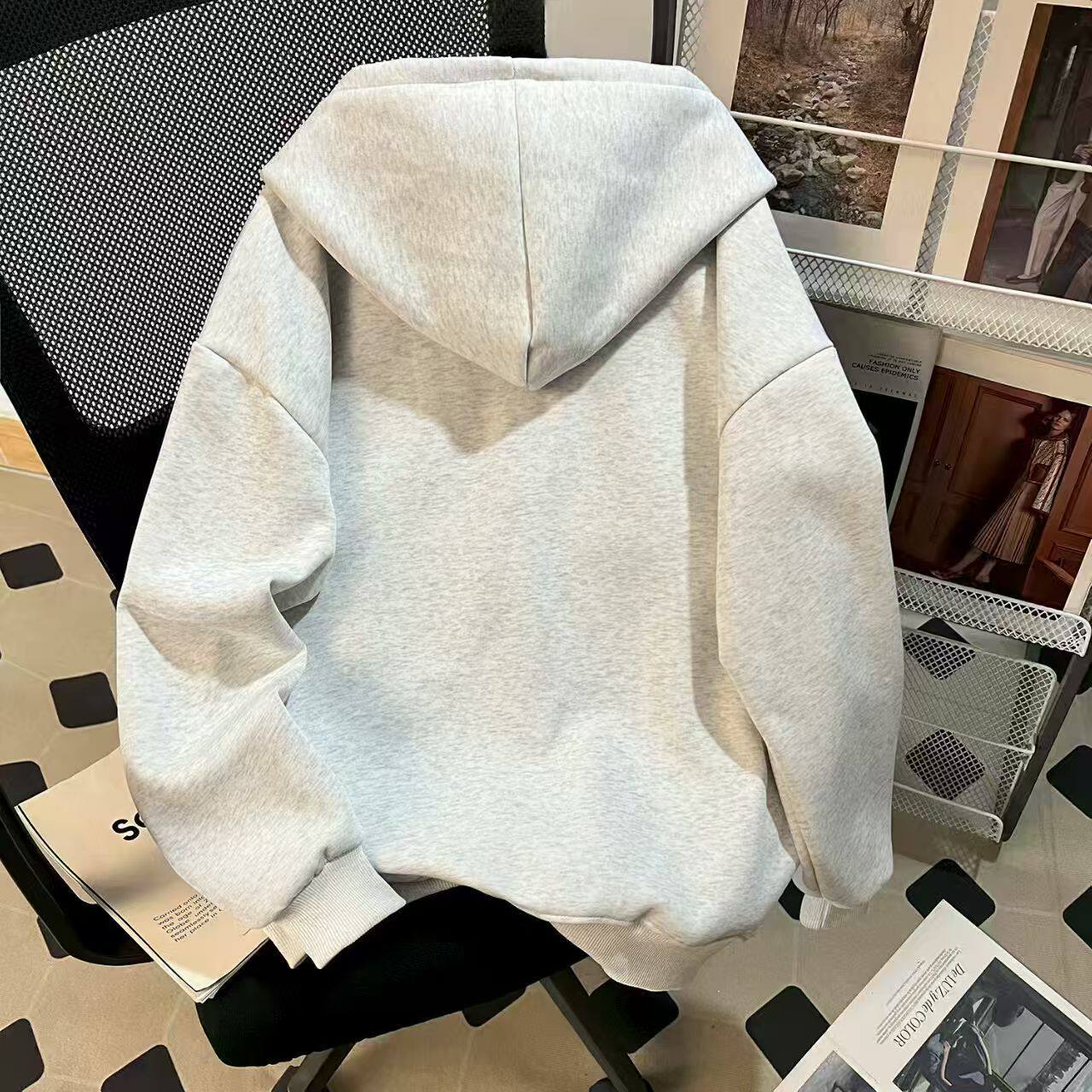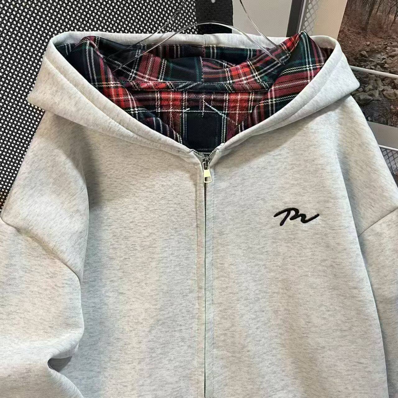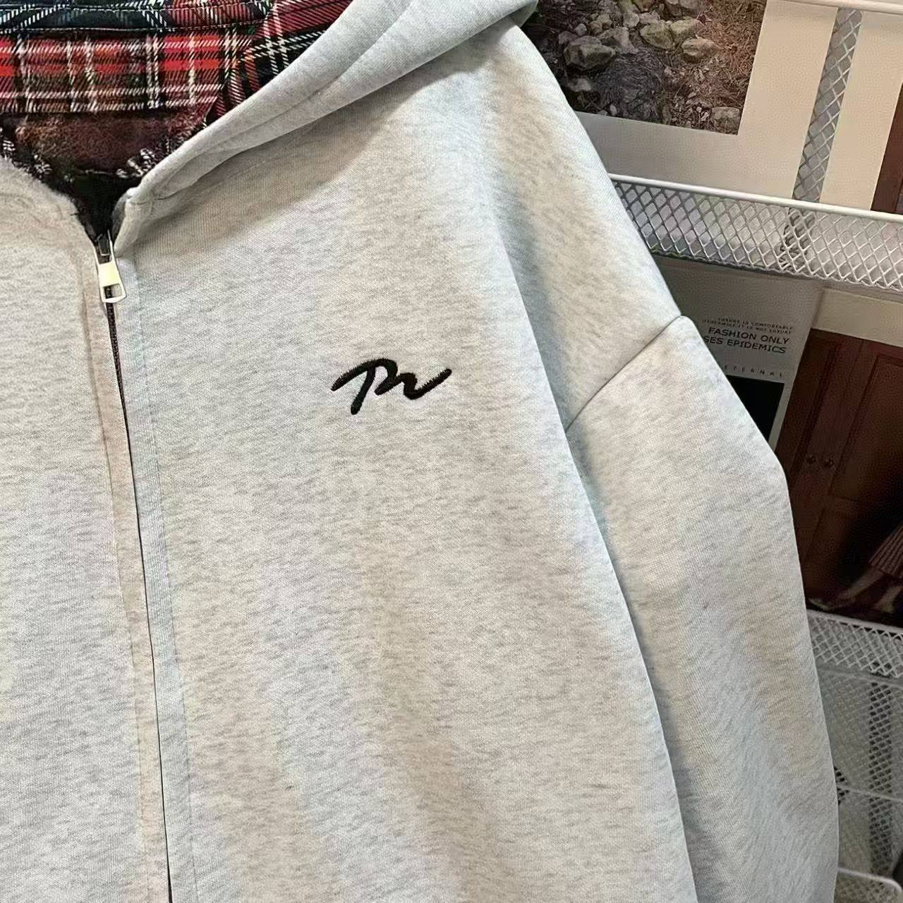 女童春秋刺绣图案外套大童秋冬新款纯棉格子拼接开衫拉链连帽卫衣