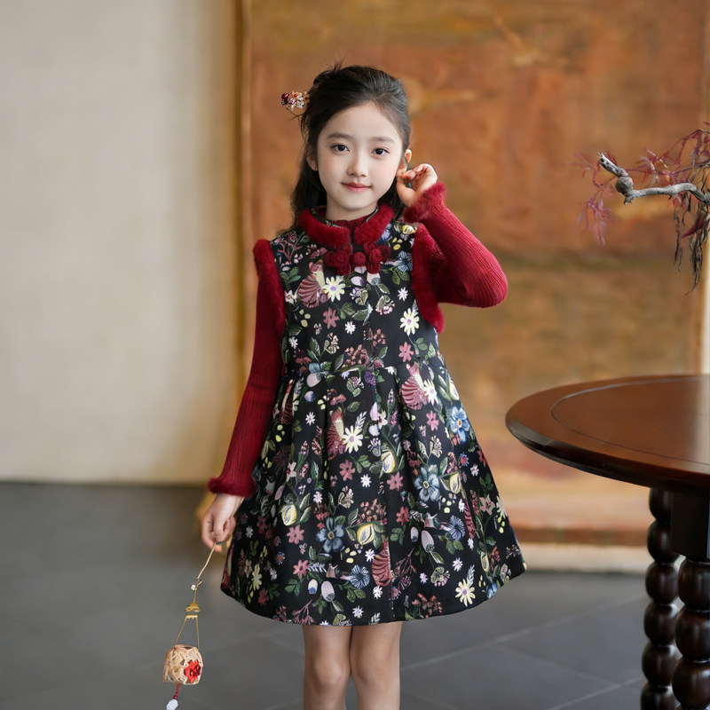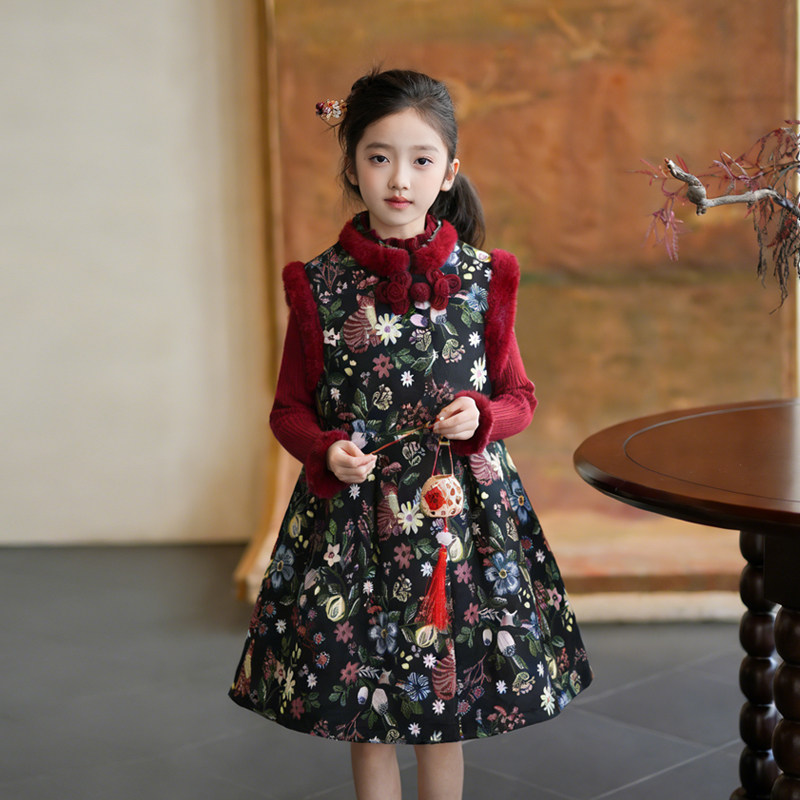 80900女童过年服连衣裙毛边夹圈保暖裙子2026新款儿童国风背心裙