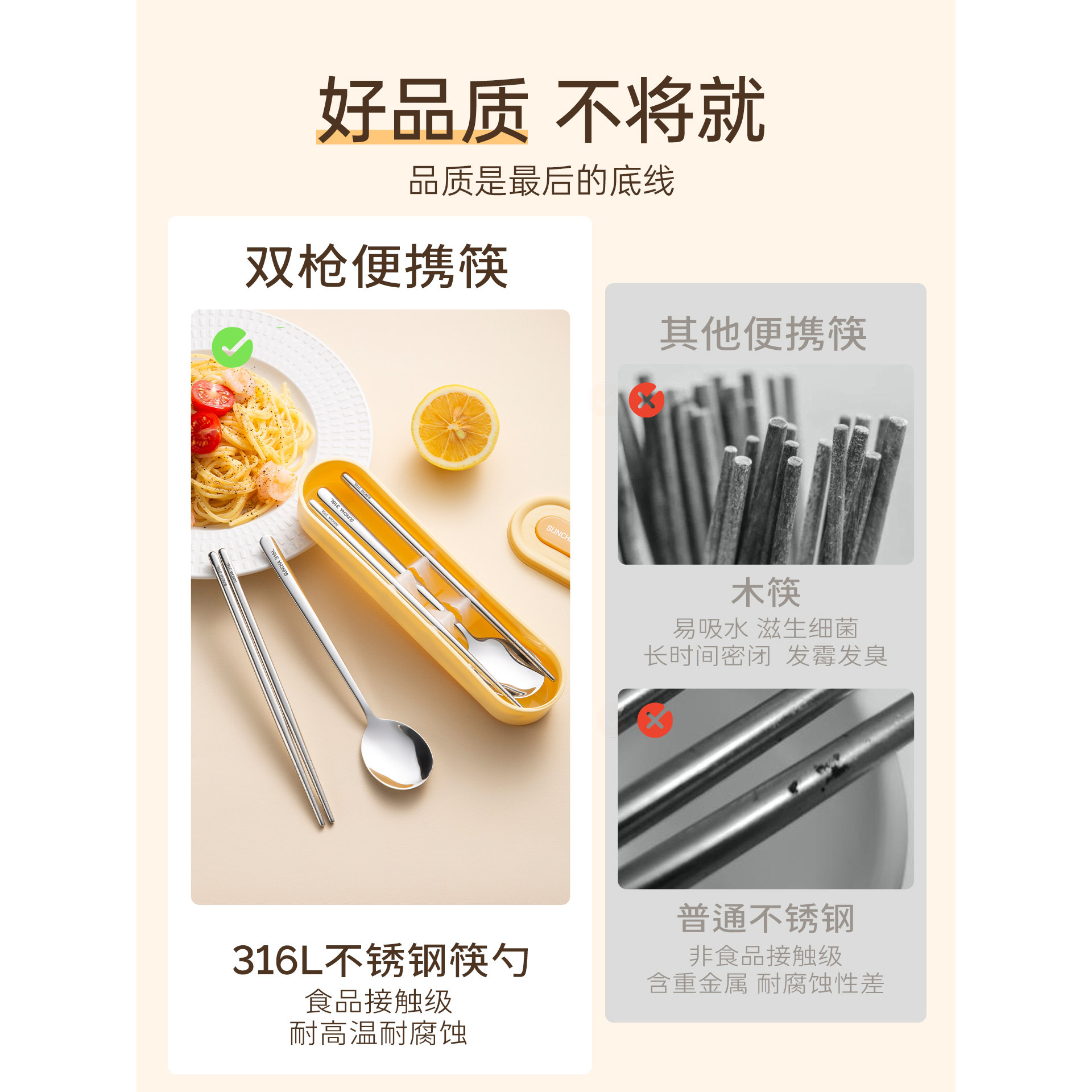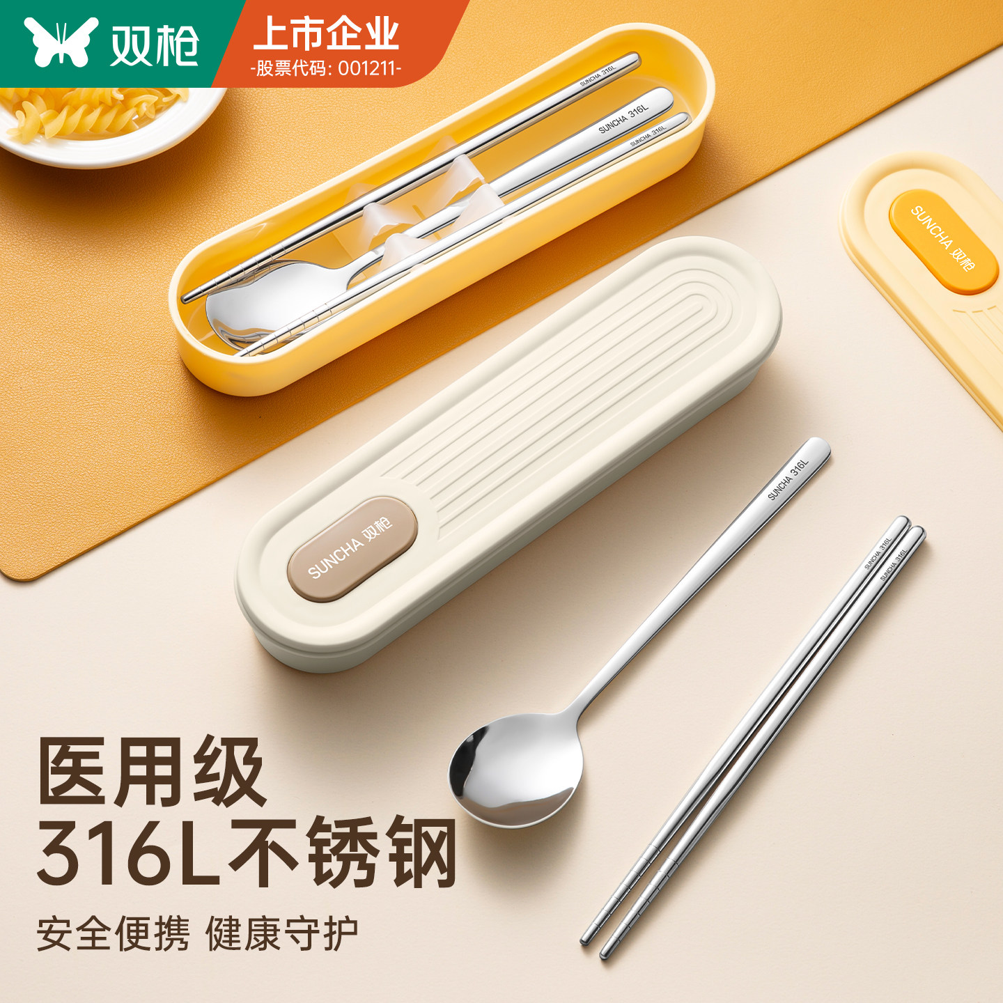 双枪学生便携餐具304不锈钢儿童筷勺套装316L筷子勺子个人专用盒