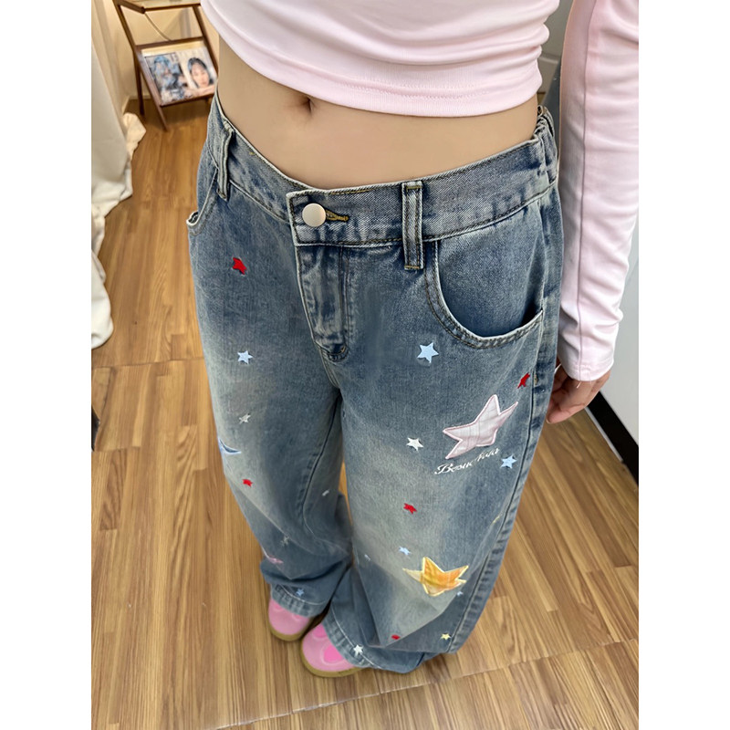 美式复古星星贴布牛仔裤裤子女款2026春秋新款宽松休闲百搭阔腿裤