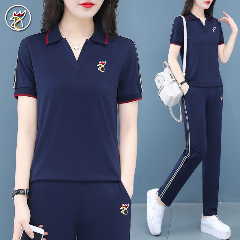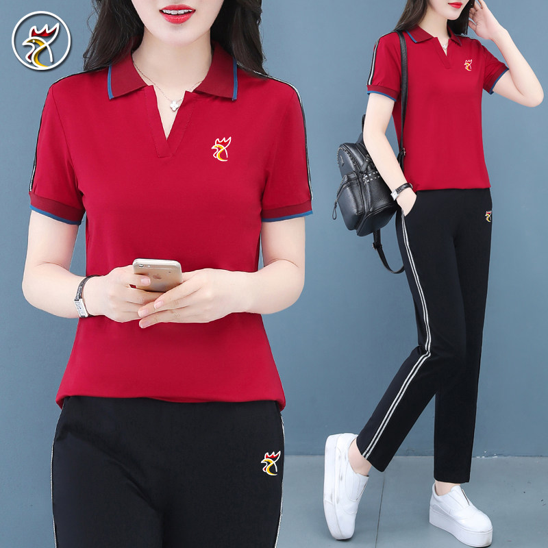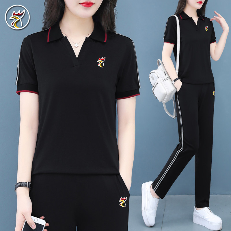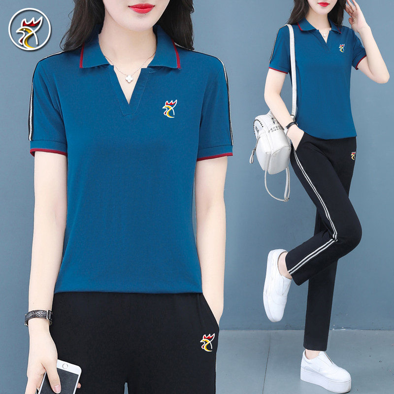 【品牌】纯棉休闲运动套装女夏季翻领polo衫两件套妈妈大码跑步服