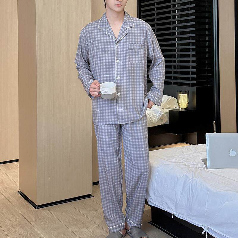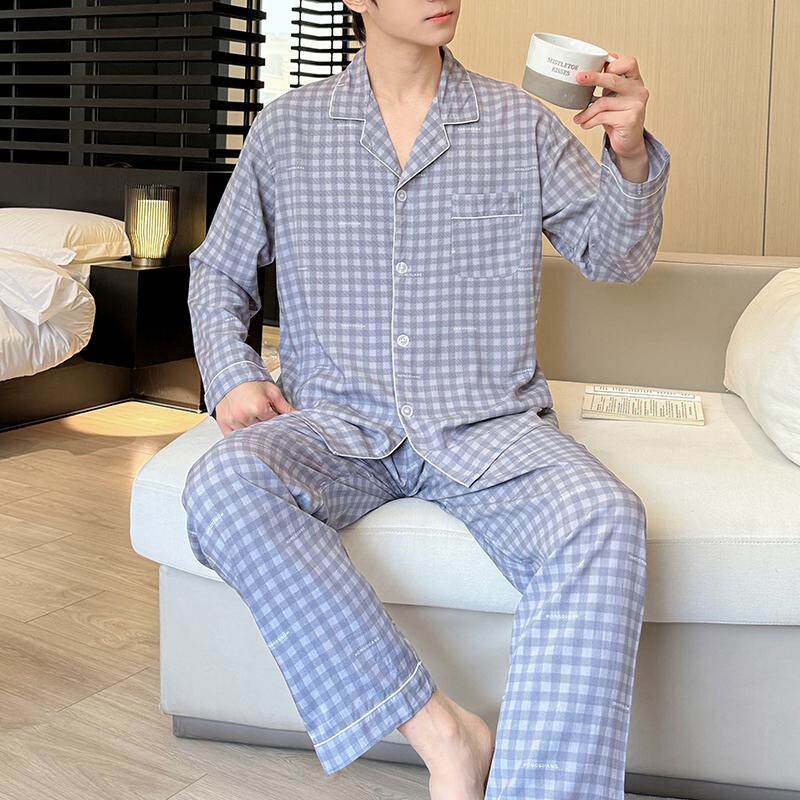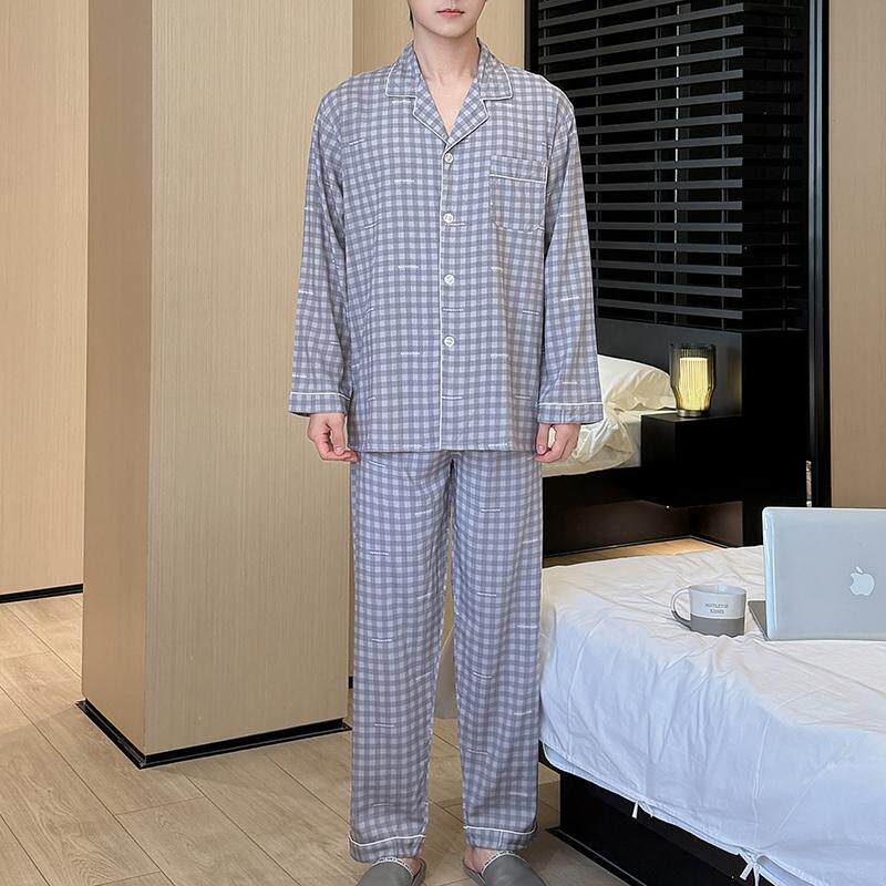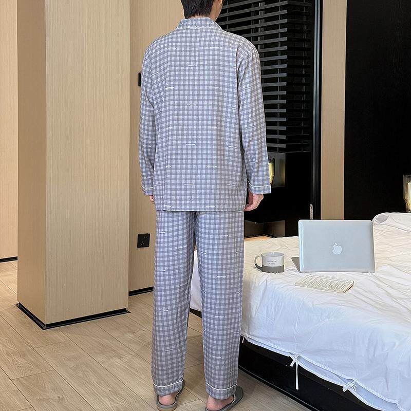 爸爸款莱赛尔棉睡衣春秋男士开衫绵绸家居服人造棉套装大码中老年