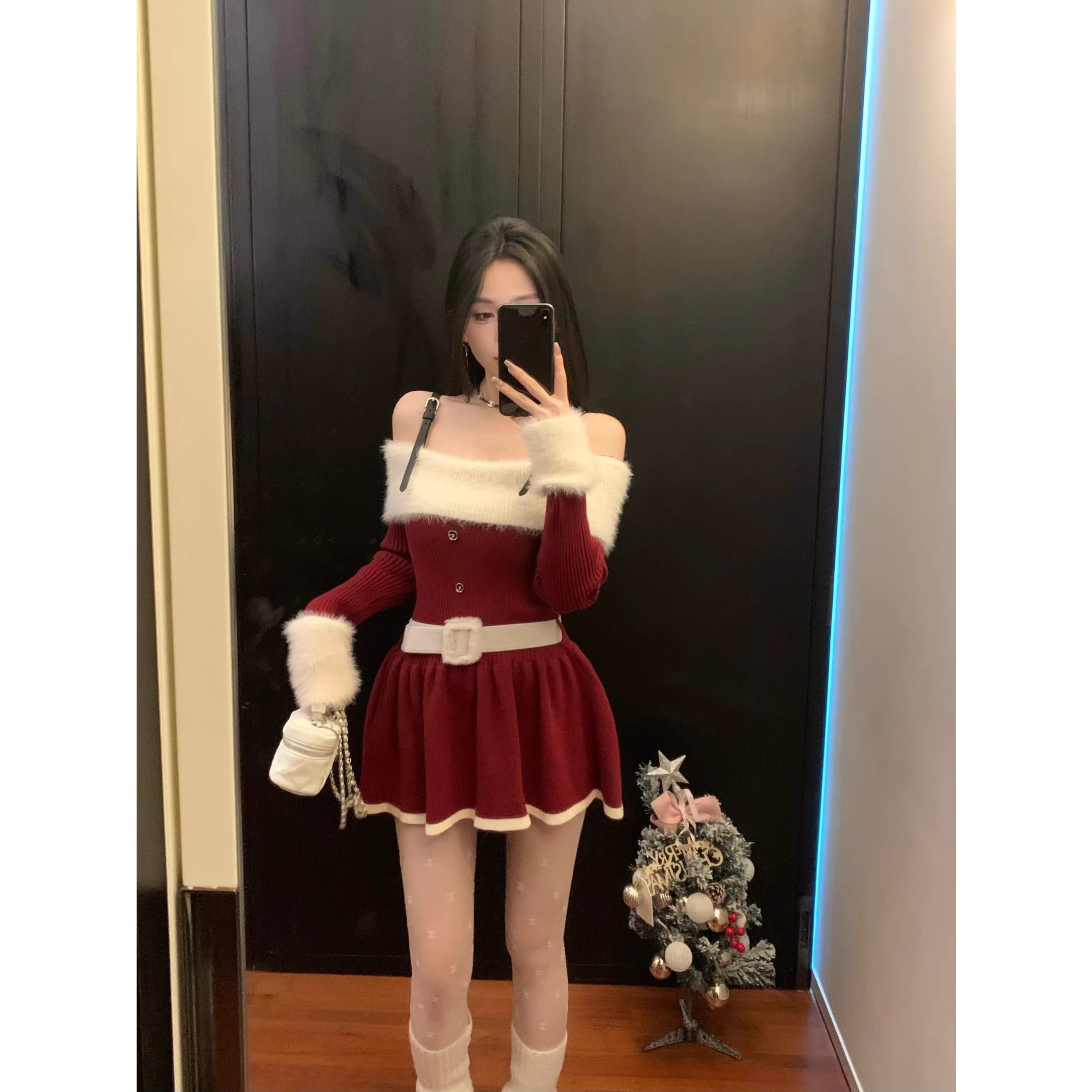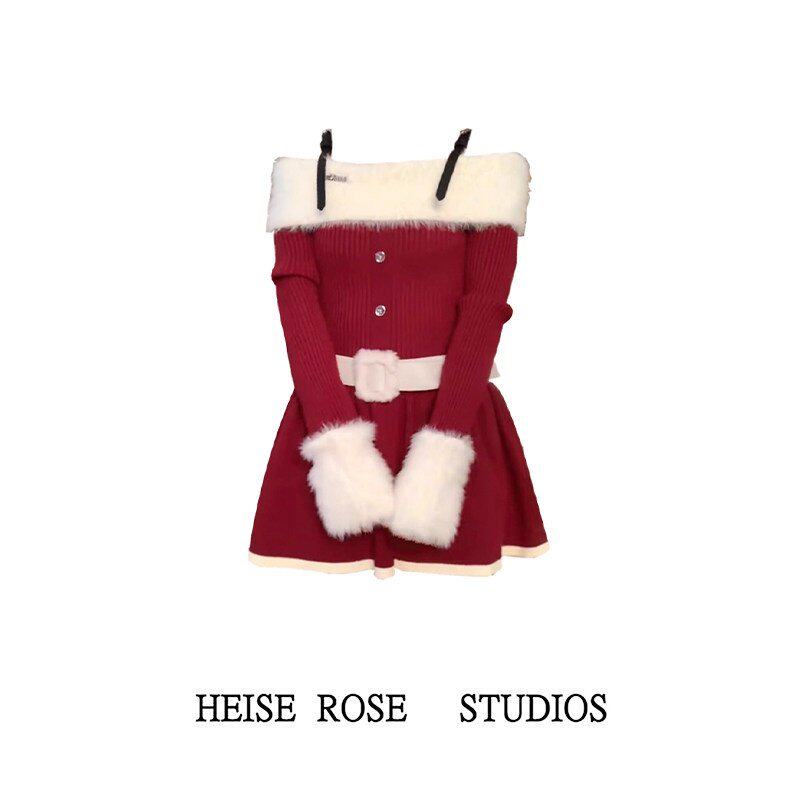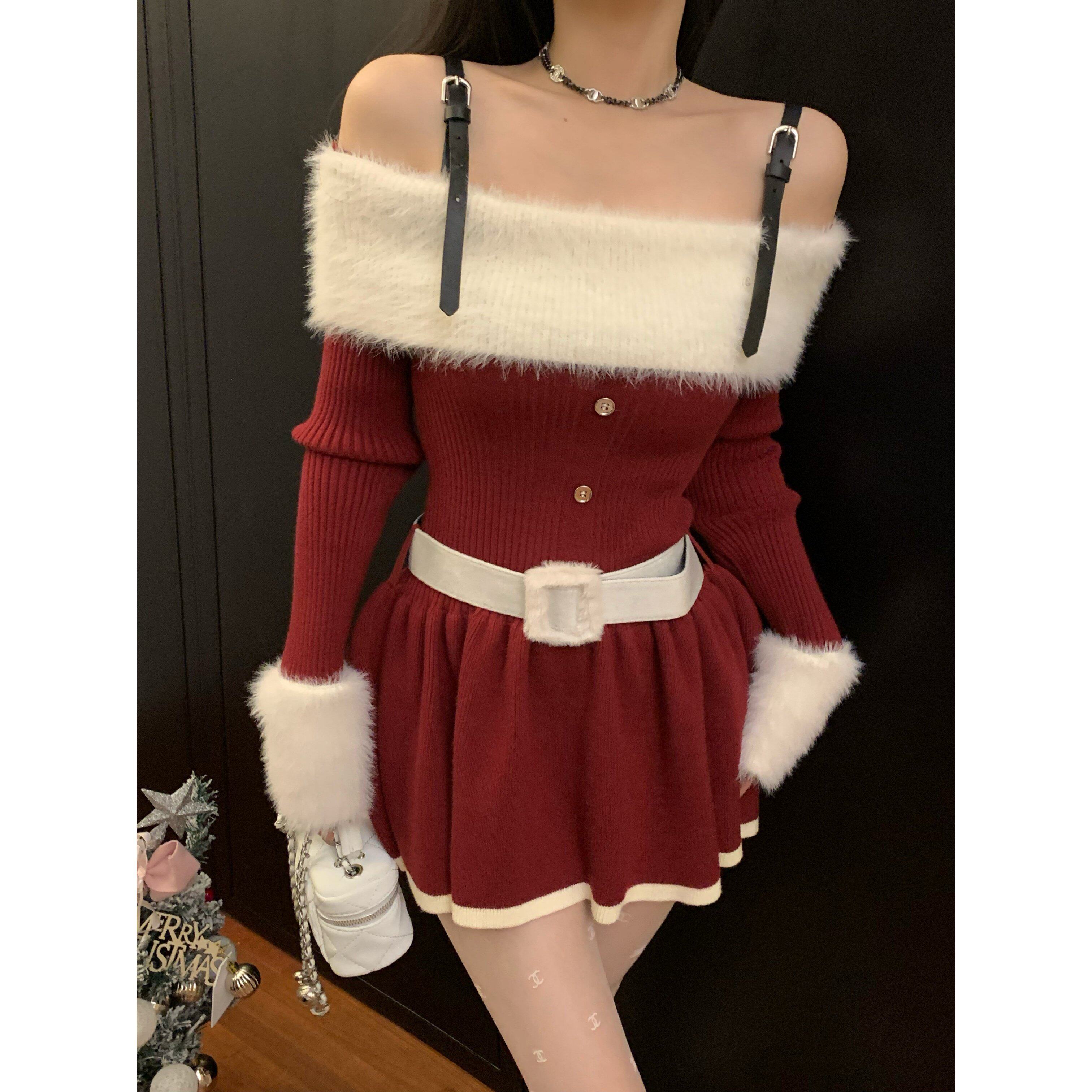 大码胖MM春秋甜美气质短裙圣诞氛围感红色一字肩长袖针织连衣裙女