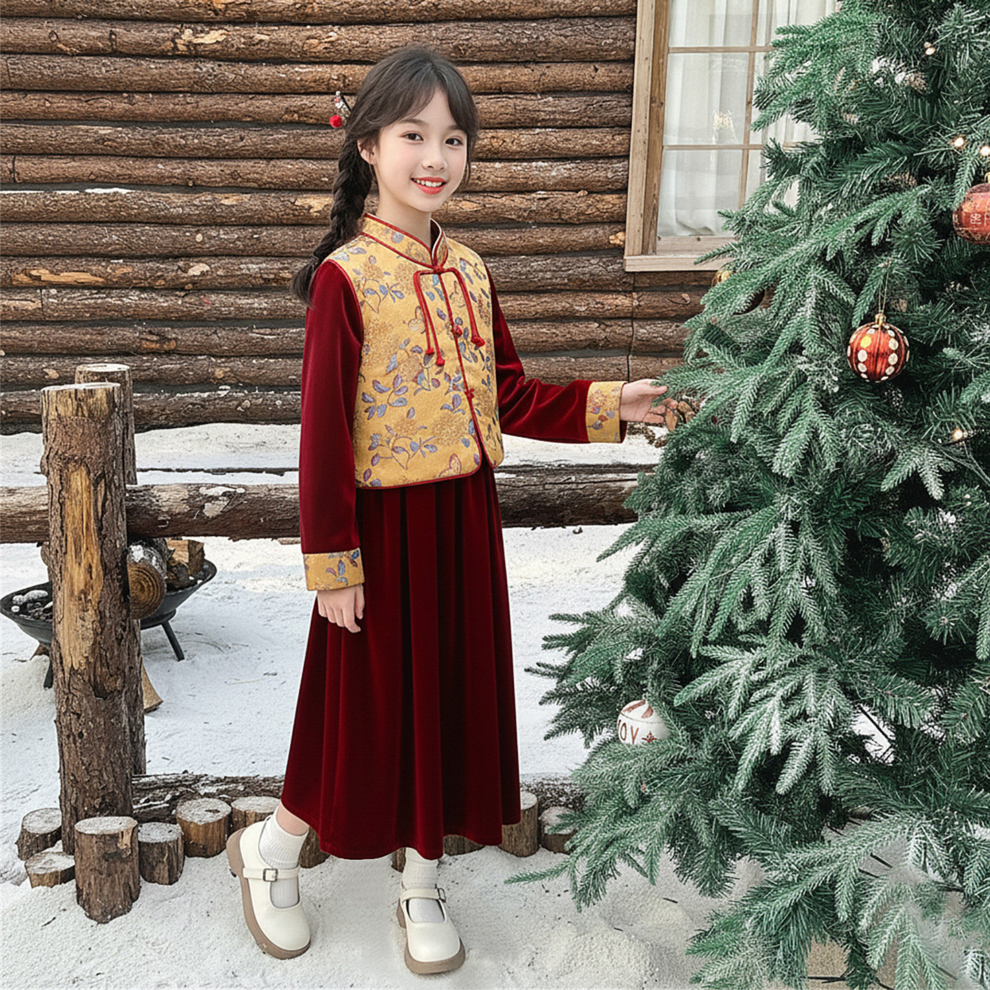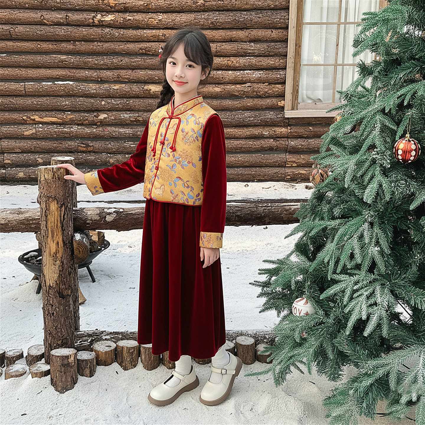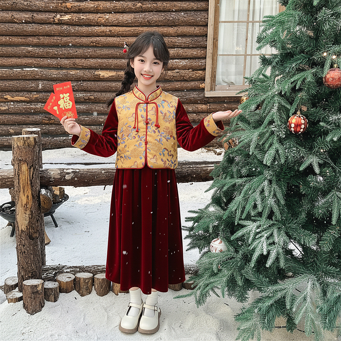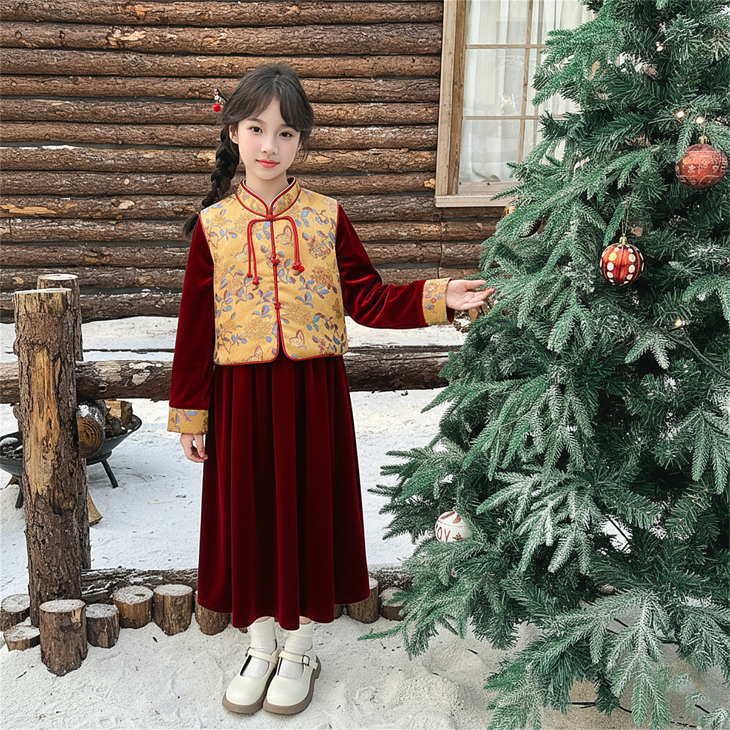 女童冬季夹棉马甲套装2026新款中国风年服加厚马夹加绒连衣裙冬款