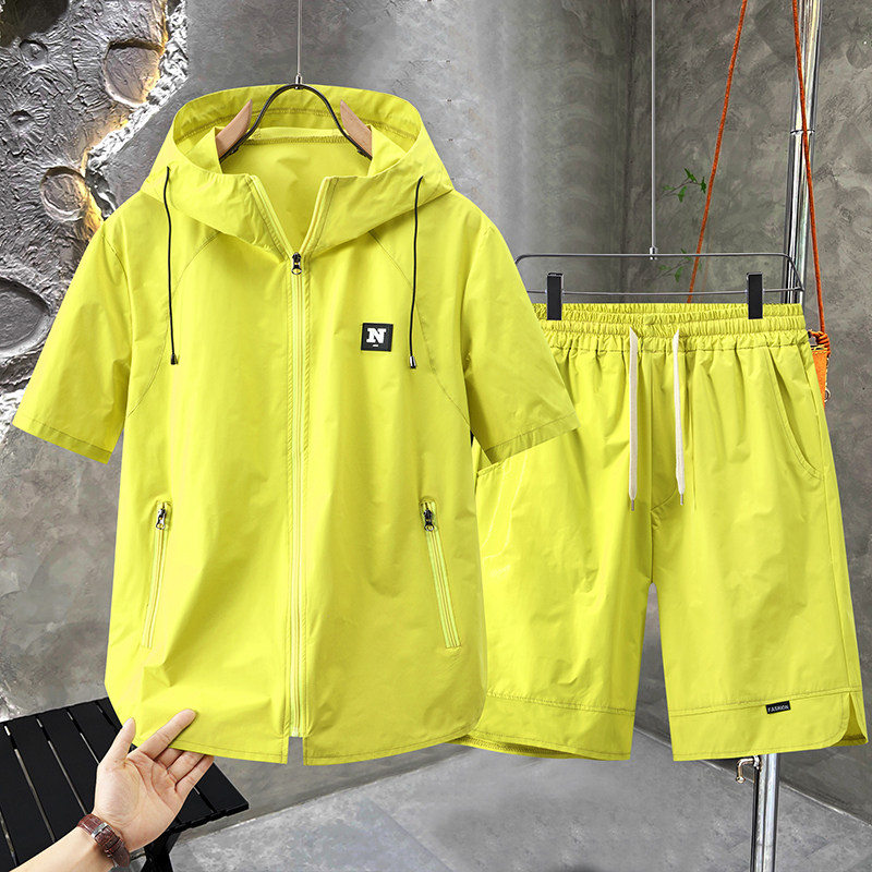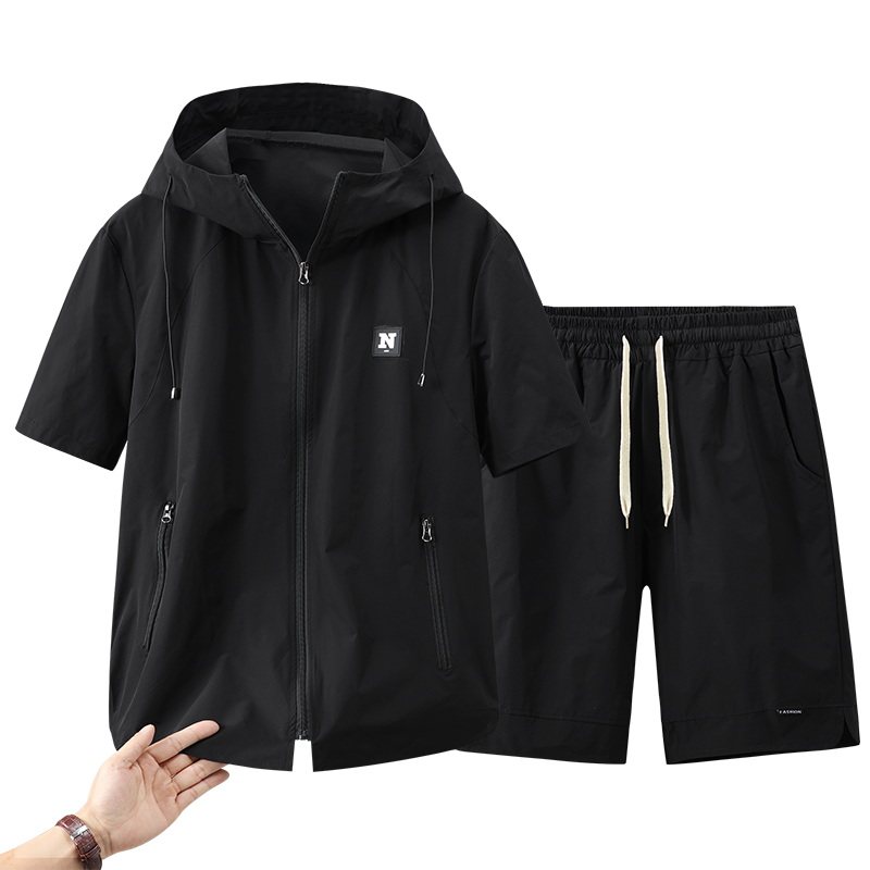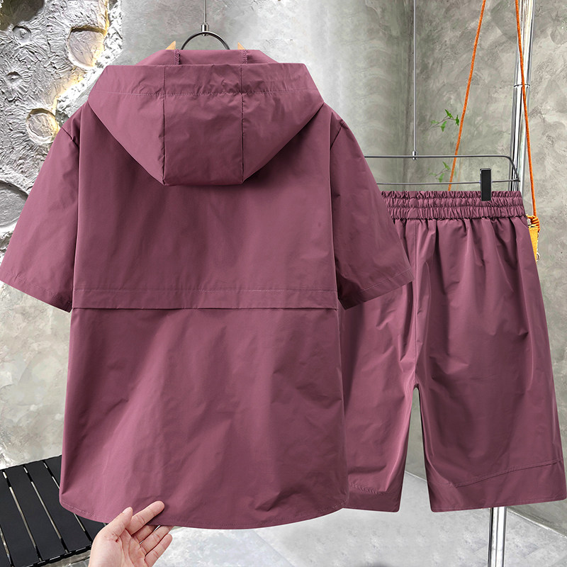 连帽拉链短袖t恤男2026新款大口袋青少年学生大码半截袖肥仔套装