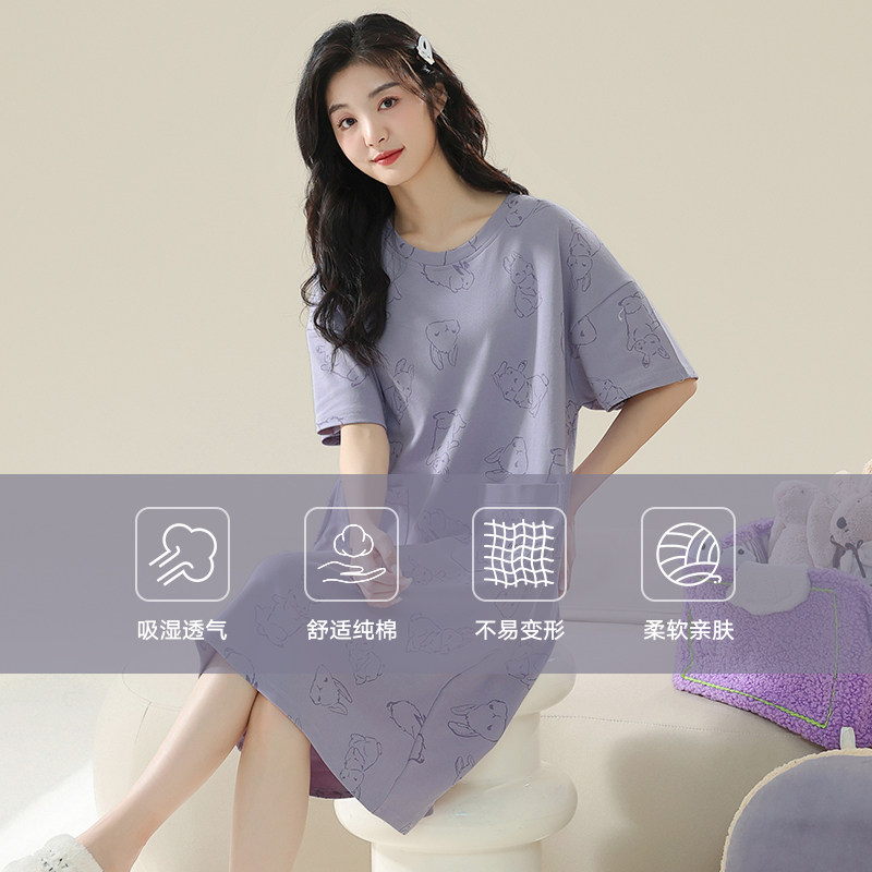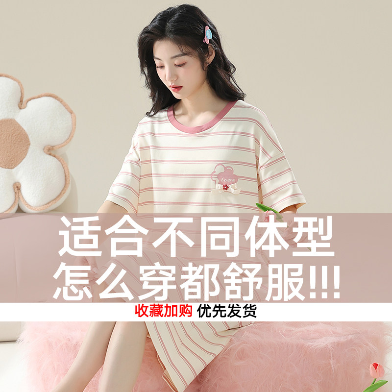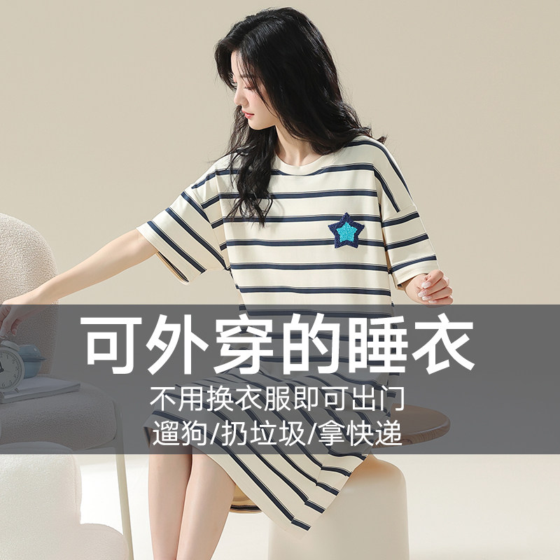 雅鹿睡裙女纯棉薄款2026年春夏季新款宽松大码圆领睡衣短袖连衣裙