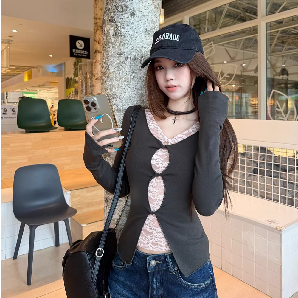 假两件镂空蕾丝针织衫女款2026春季新款修身长袖t恤内搭打底上衣