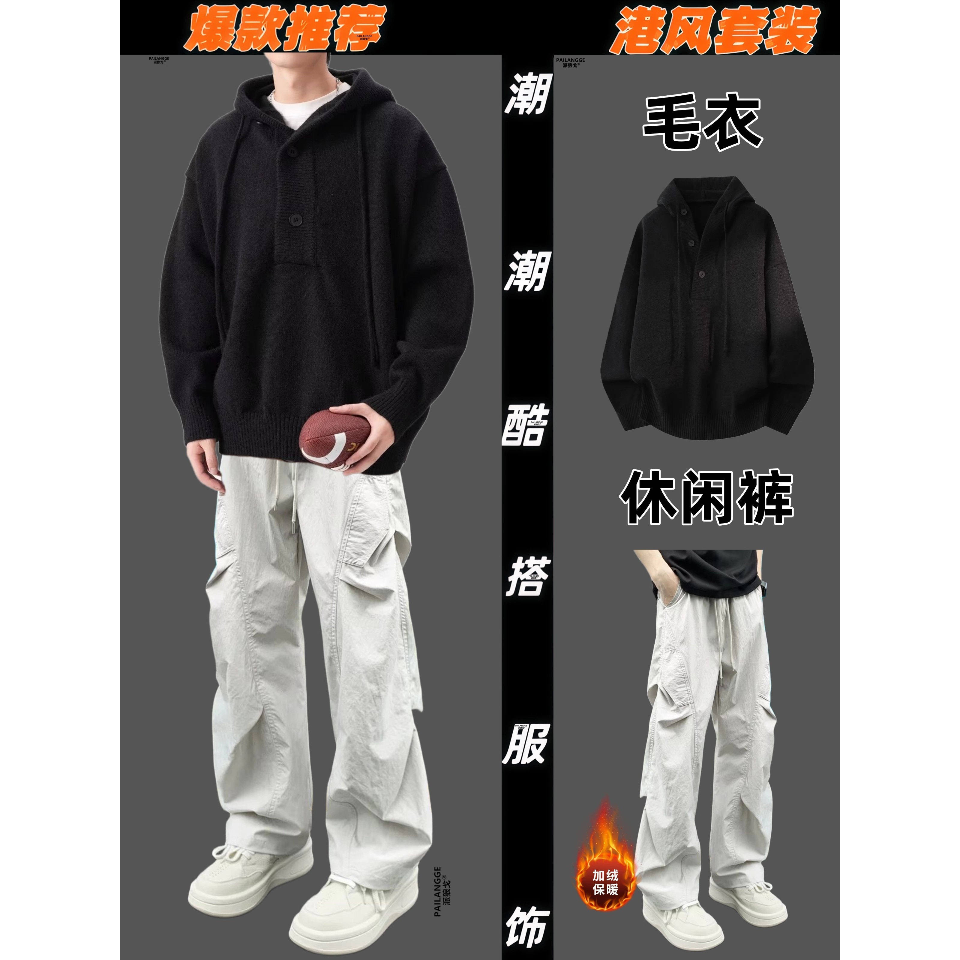 慵懒风连帽红色针织衫套装男生秋冬青少年潮流搭配两件套毛衣外套