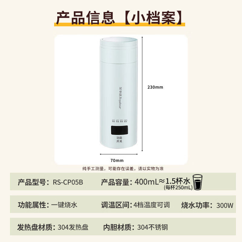 荣事.达电热水杯RS-CP05B便携式烧水壶加热直饮杯400ml智能数显