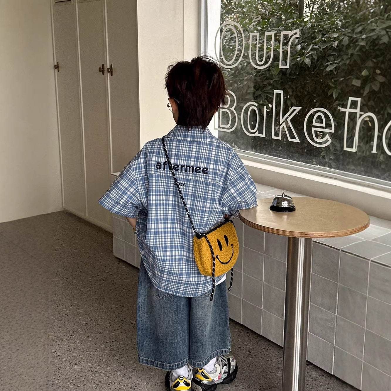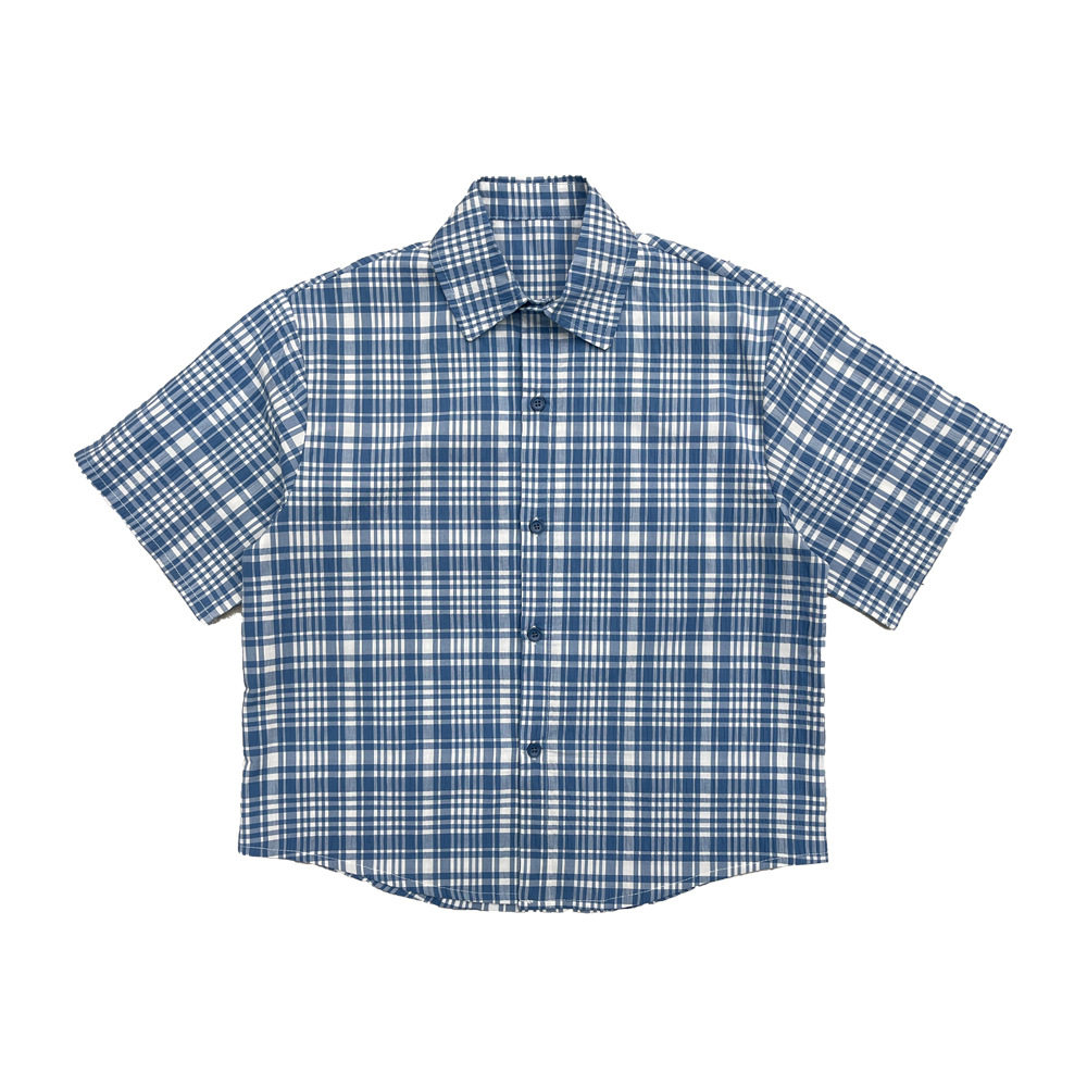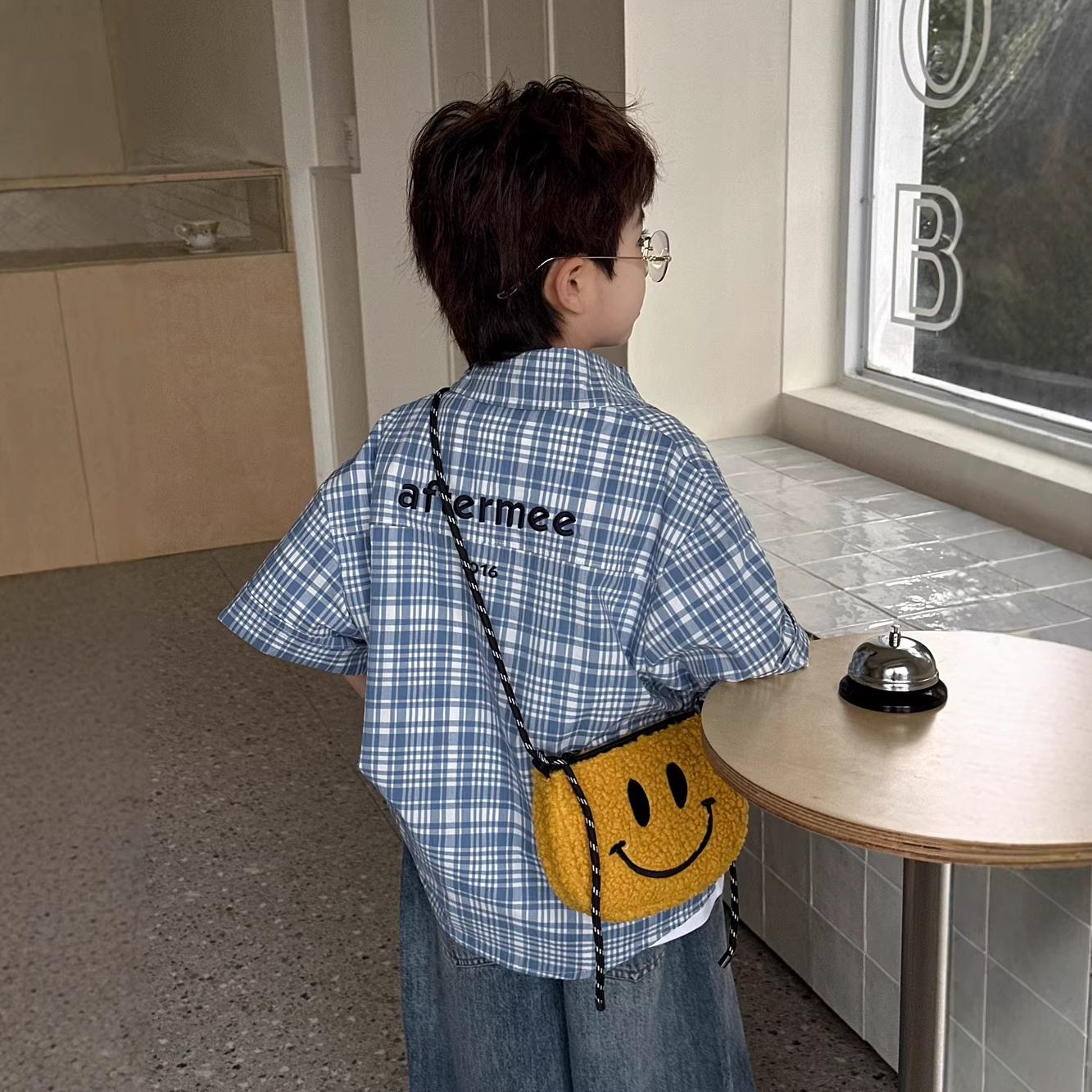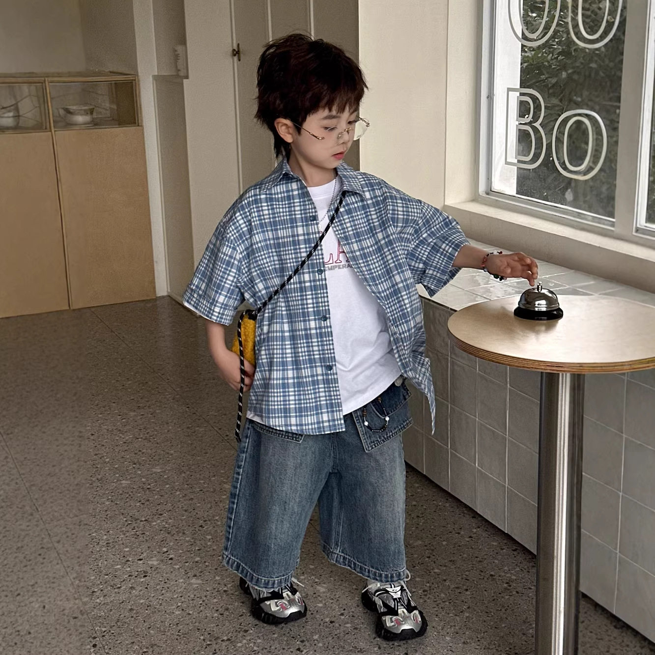 小杰家2026春夏新款蓝白小格子短袖衬衫字母刺绣男童宽松短袖衬衣