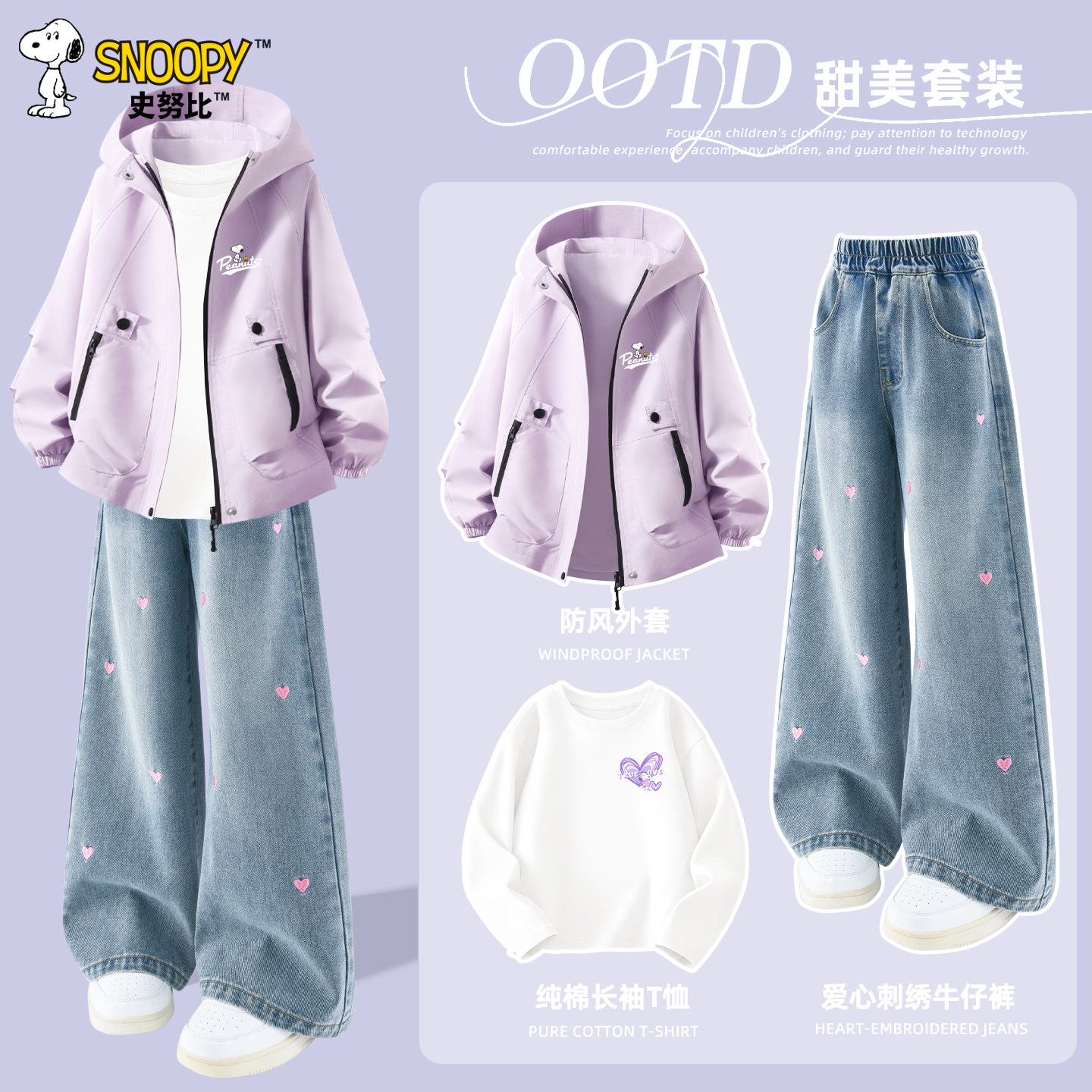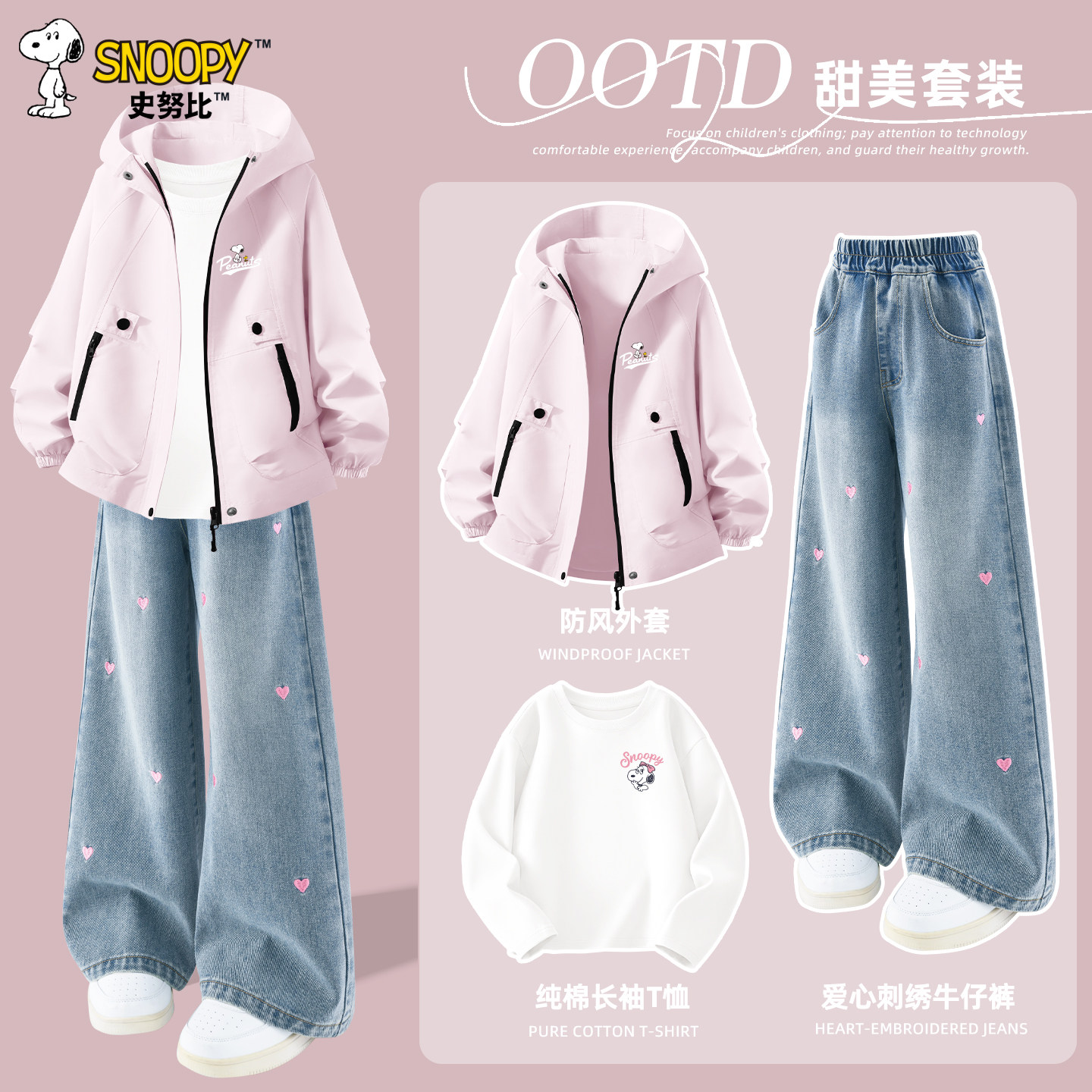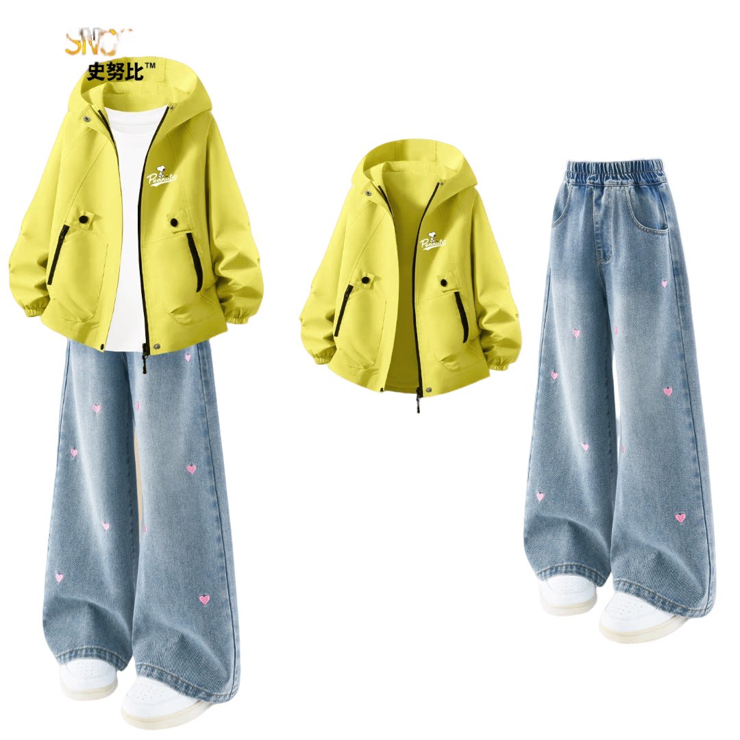 史努比儿童套装2026新款春装中大童时尚外套牛仔裤女童衣服三件套