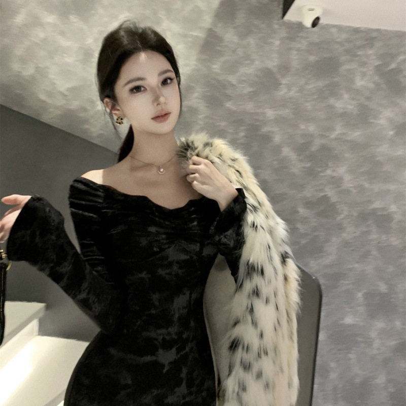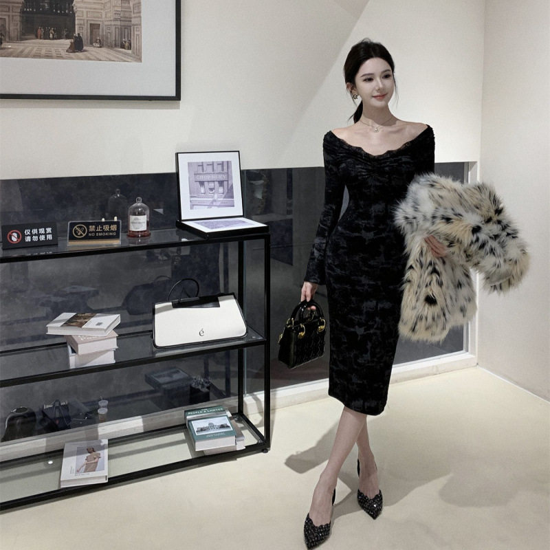 黑色一字肩长袖连衣裙女高级感小个子修身气质收腰蕾丝包臀长裙子
